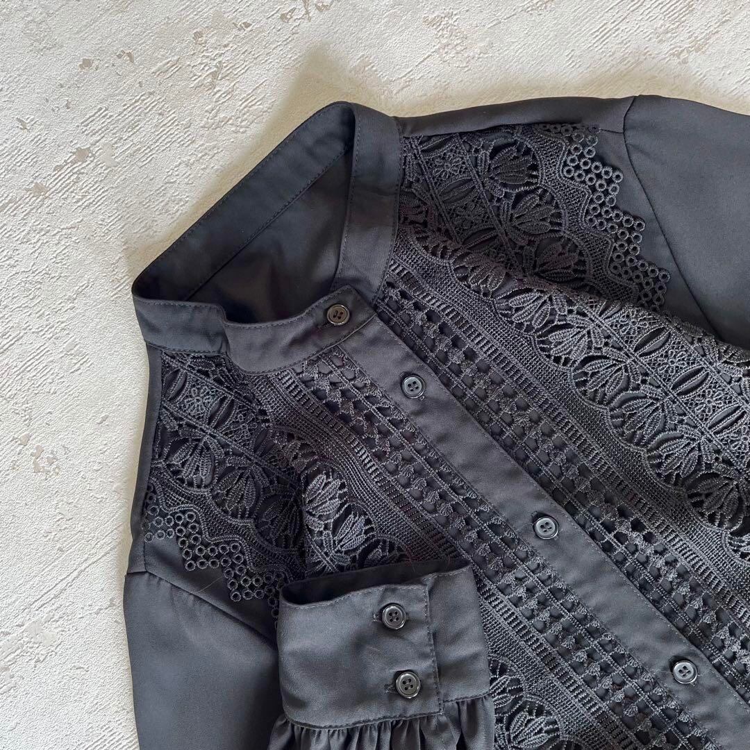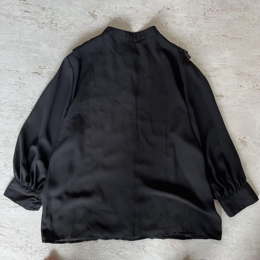 昭和レトロ花柄刺繍入り七分袖ブラウス透け素材Mサイズブラックab