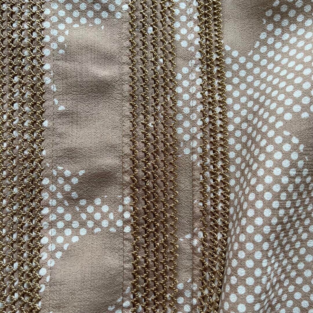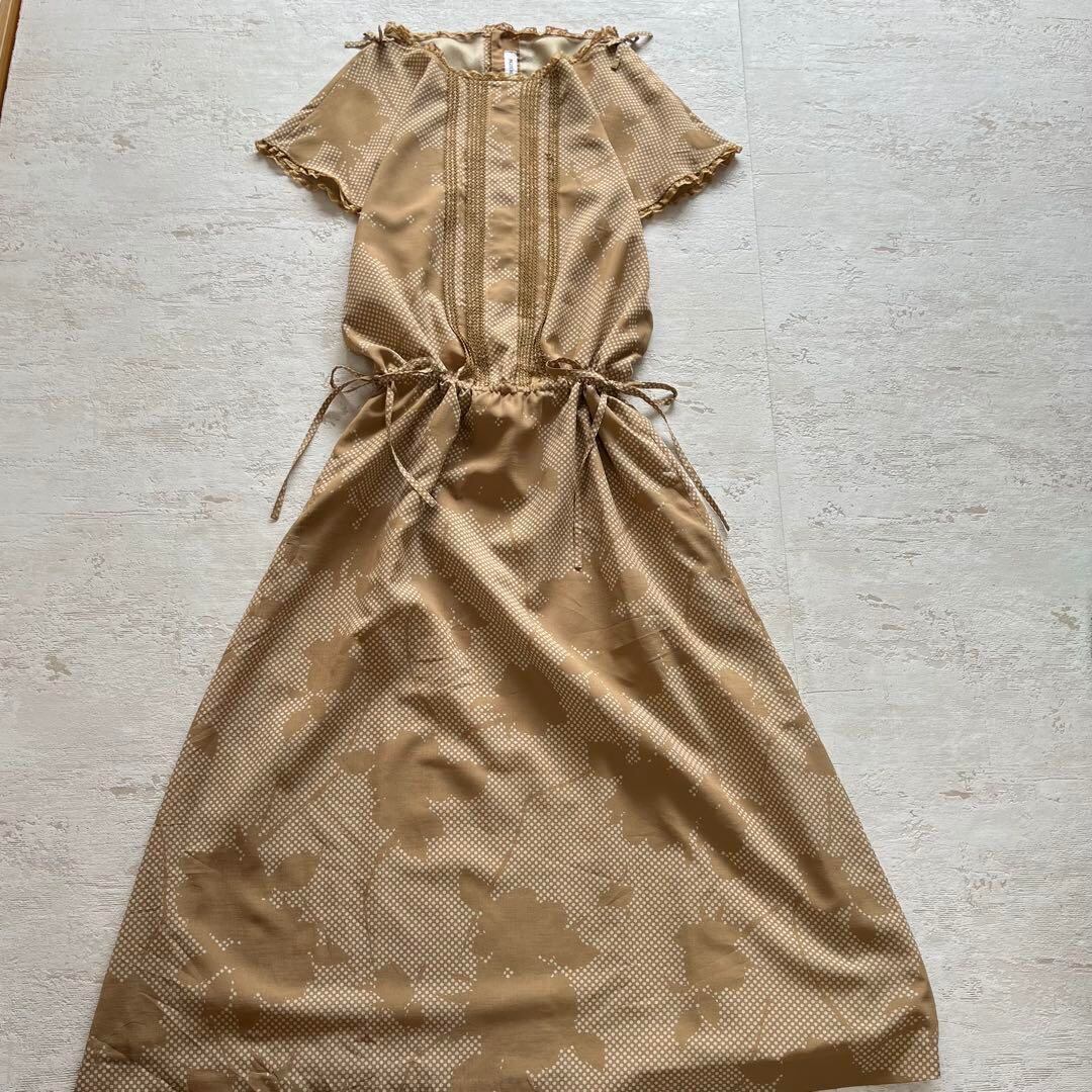 インゲボルグドットとリーフ柄半袖ロングワンピースリボン付きベージュE2