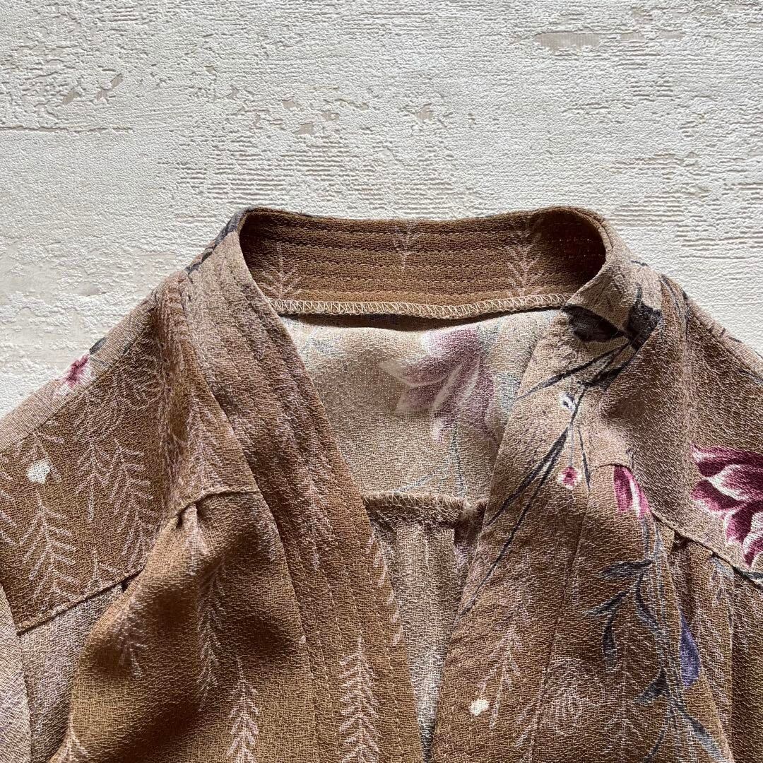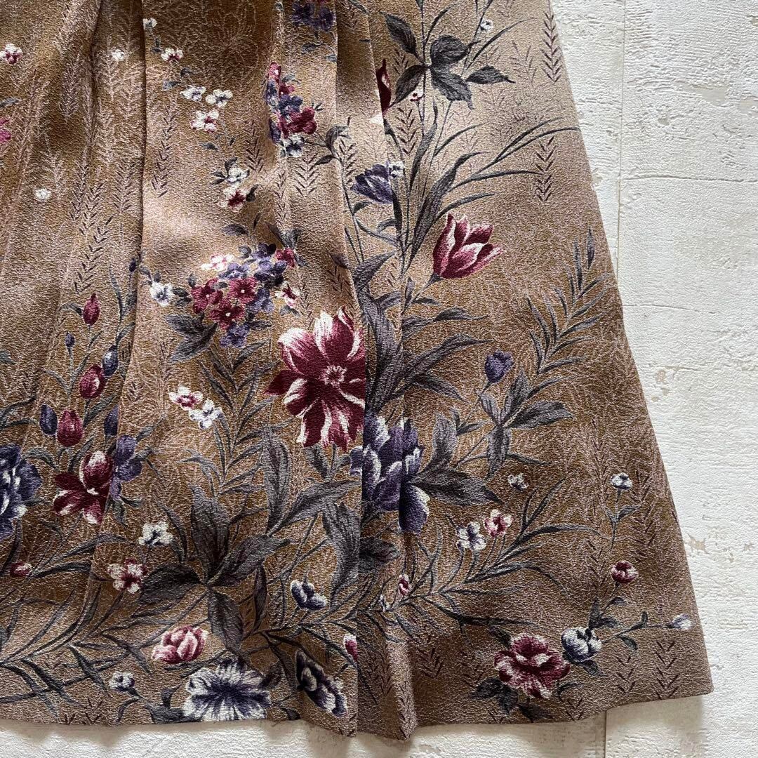 昭和レトロ渋かわ半袖ロングワンピースベルト付き花柄ブラウンフリーサイズE2