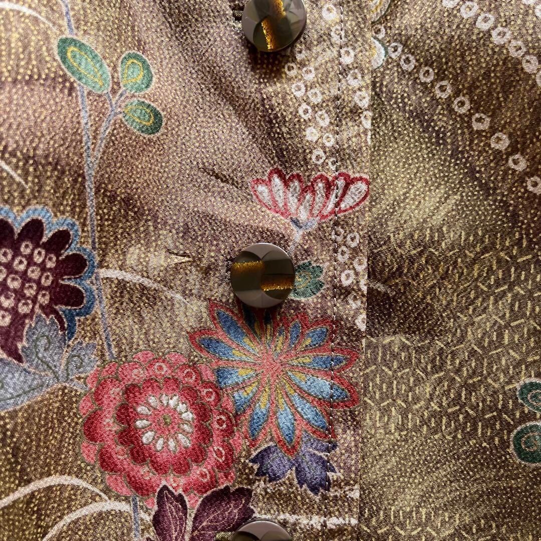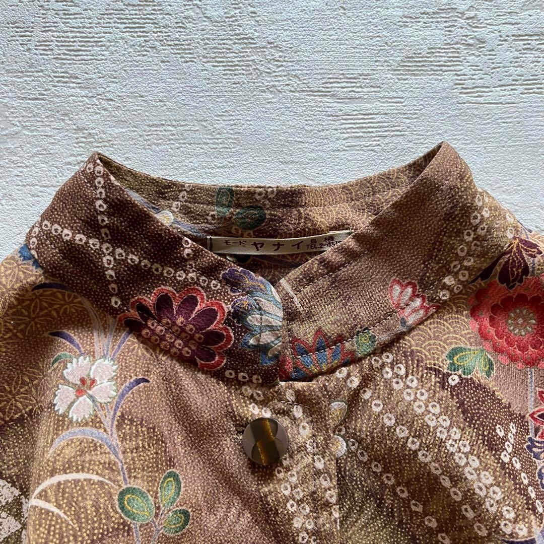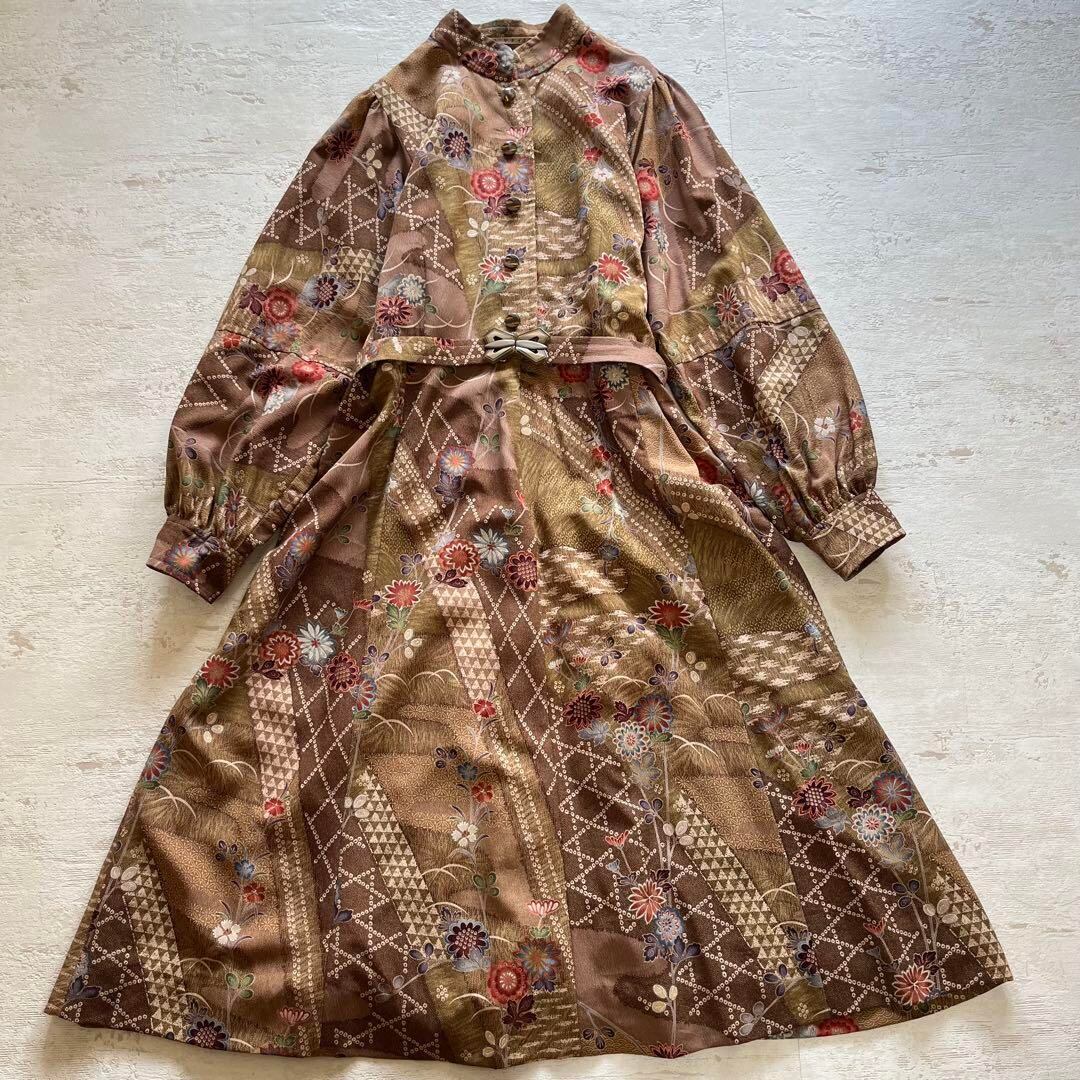 昭和レトロカラフル長袖ロングワンピース着物生地ベルト付きブラウンT1