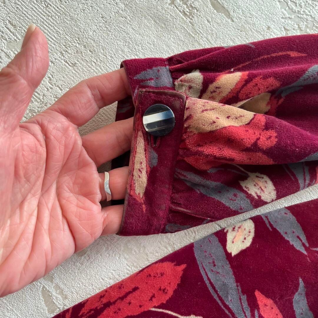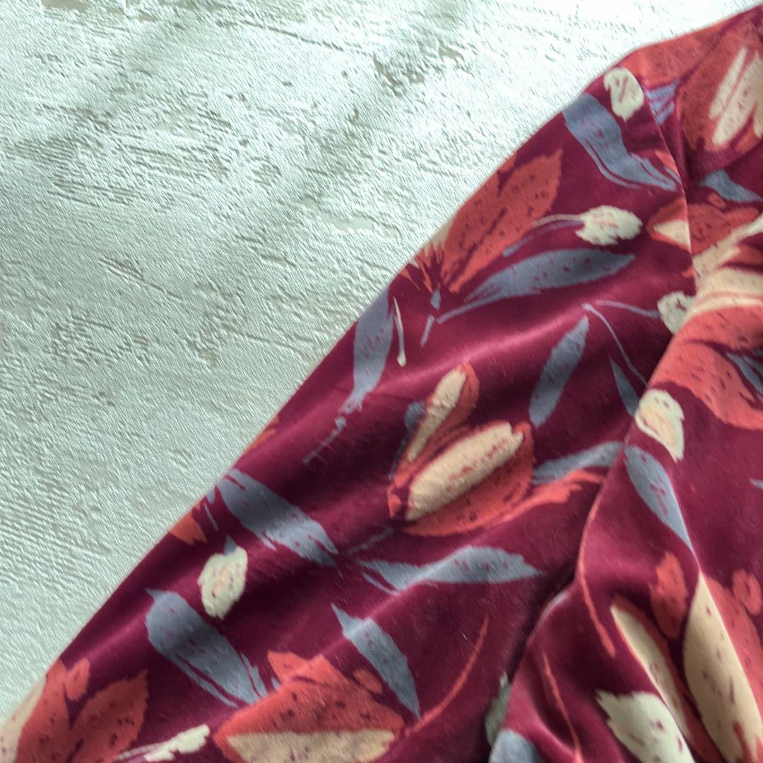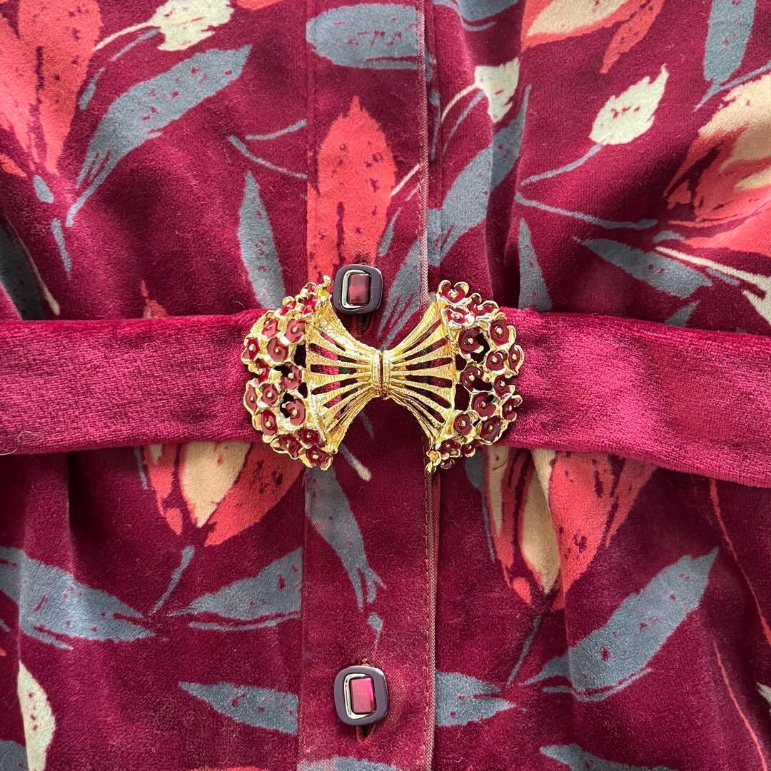昭和レトロアート風花柄長袖ロングワンピースベルベット素材ベルト付きフリーサイズ