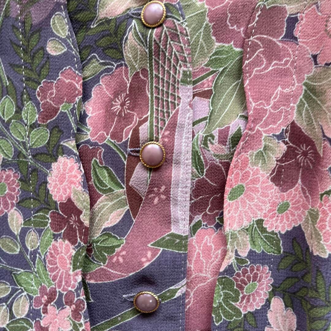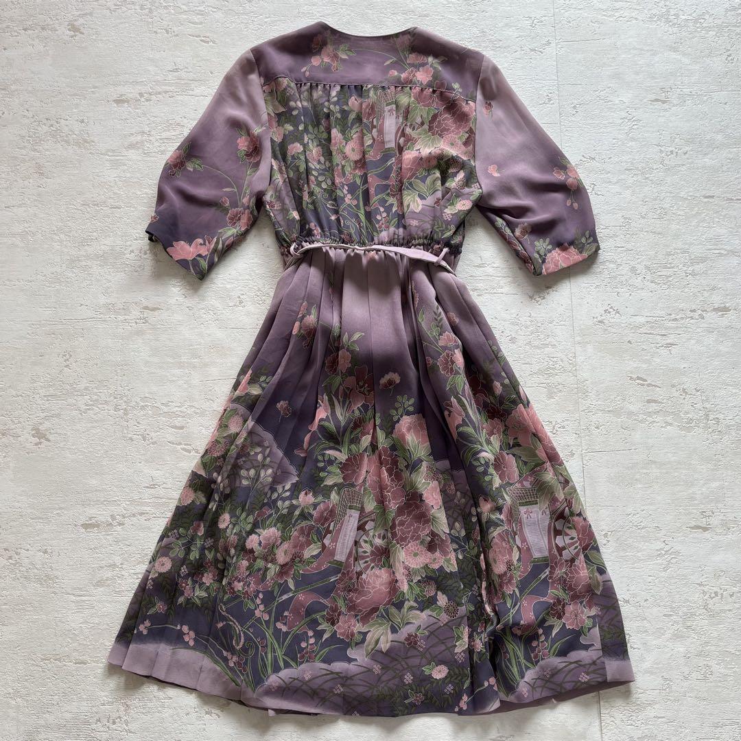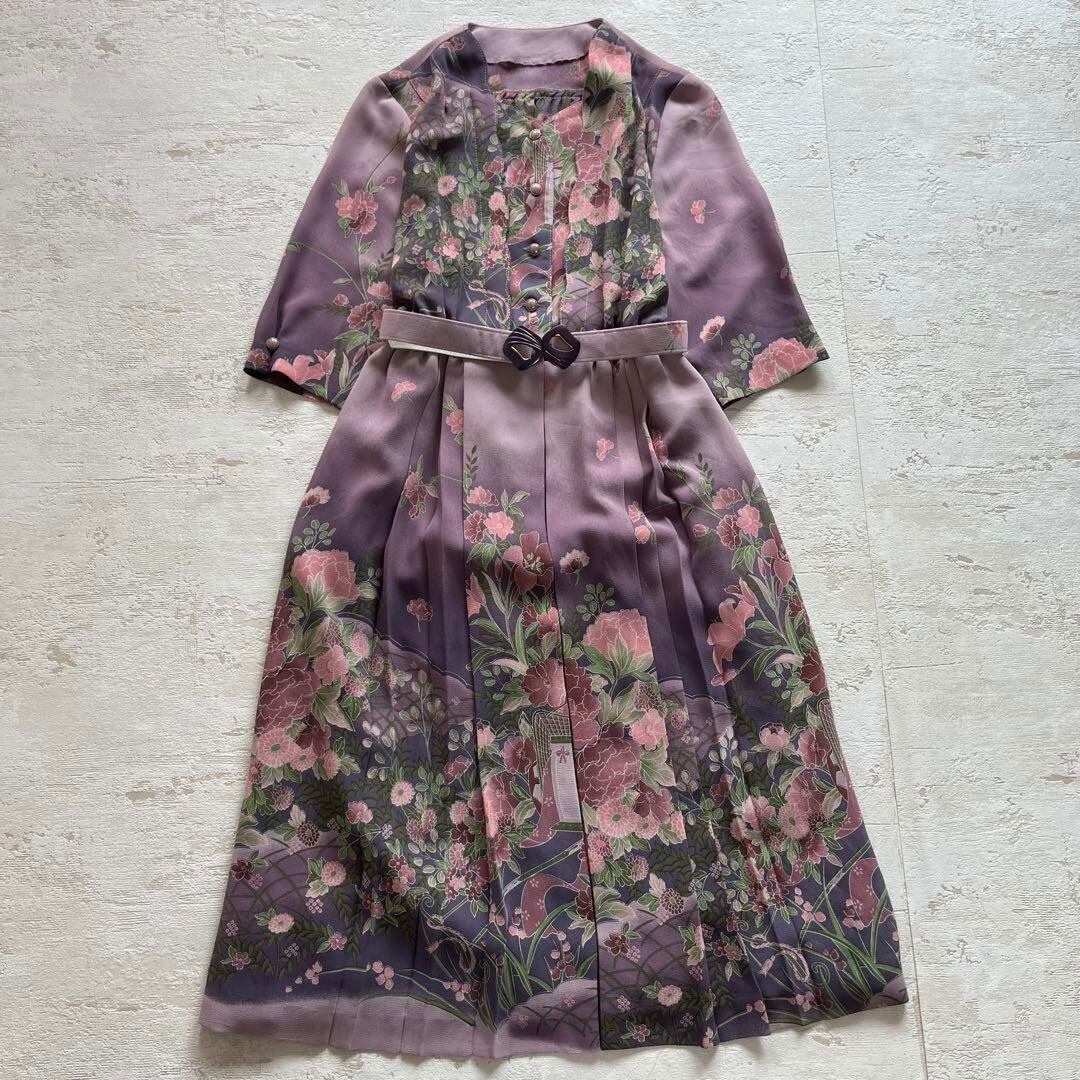 昭和レトロ和柄半袖ロングワンピースベルト付き透け素材花柄花籠パープルY1
