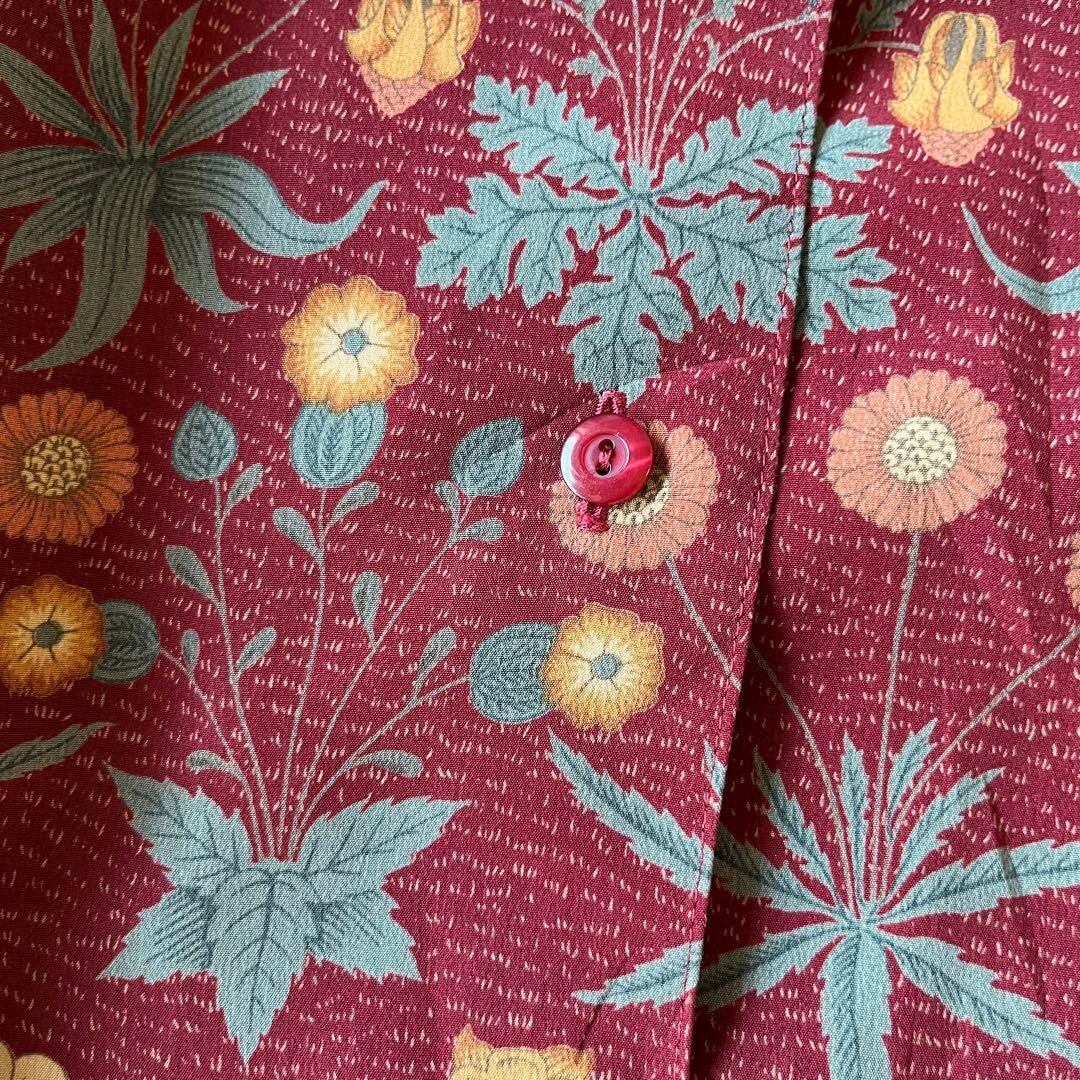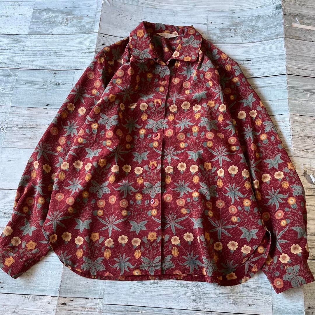 昭和レトロボタニカル長袖ブラウスオープンカラー植物柄えんじMサイズae