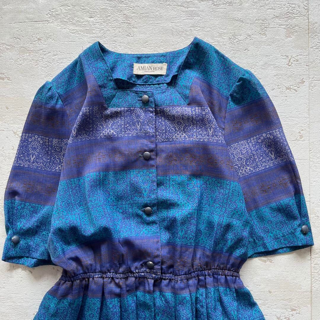 昭和レトロボーダー柄半袖ロングワンピース透け素材ヨーロピアン風ブルー13号F3