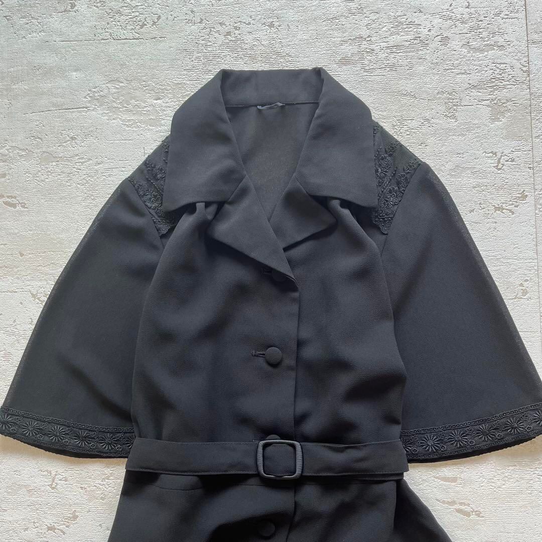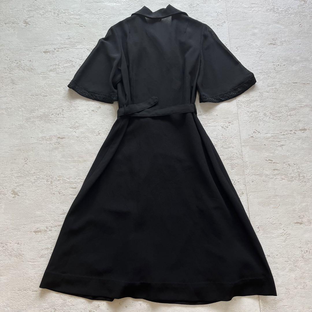 昭和レトロ花柄刺繍入り半袖ロングワンピースベルト付きフォーマルブラック9号q1