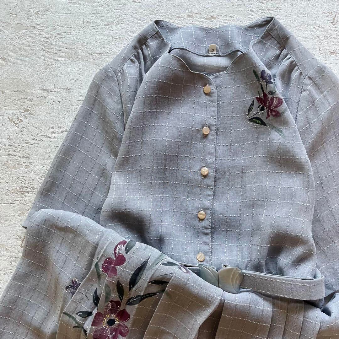 昭和レトロ渋かわ半袖ロングワンピースベルト付き花柄ペタルカラー13号グリーンf1