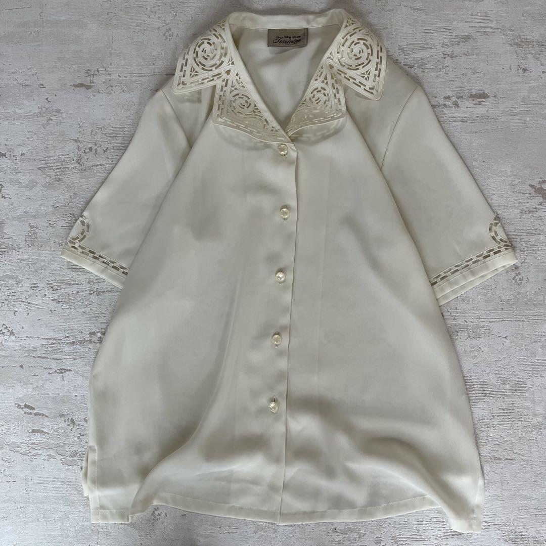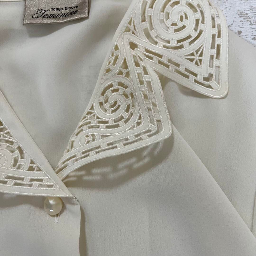昭和レトロ刺繍入り襟付き半袖ブラウスオープンカラークリームMサイズf1