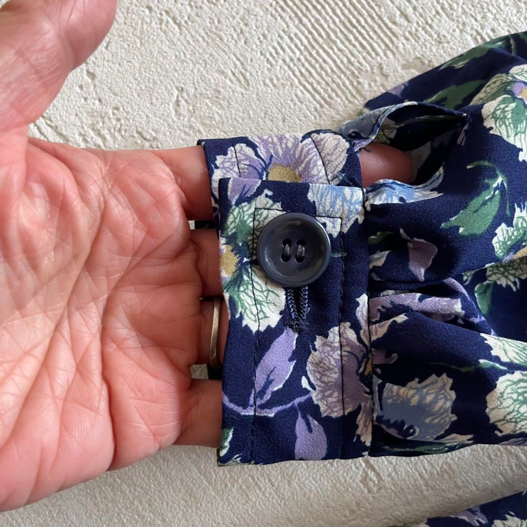 昭和レトロ花柄長袖ロングワンピースリボン襟透け素材総柄ネイビーフリーサイズE1