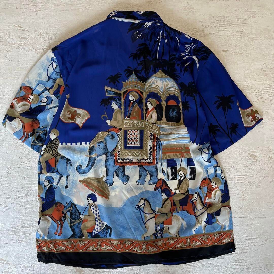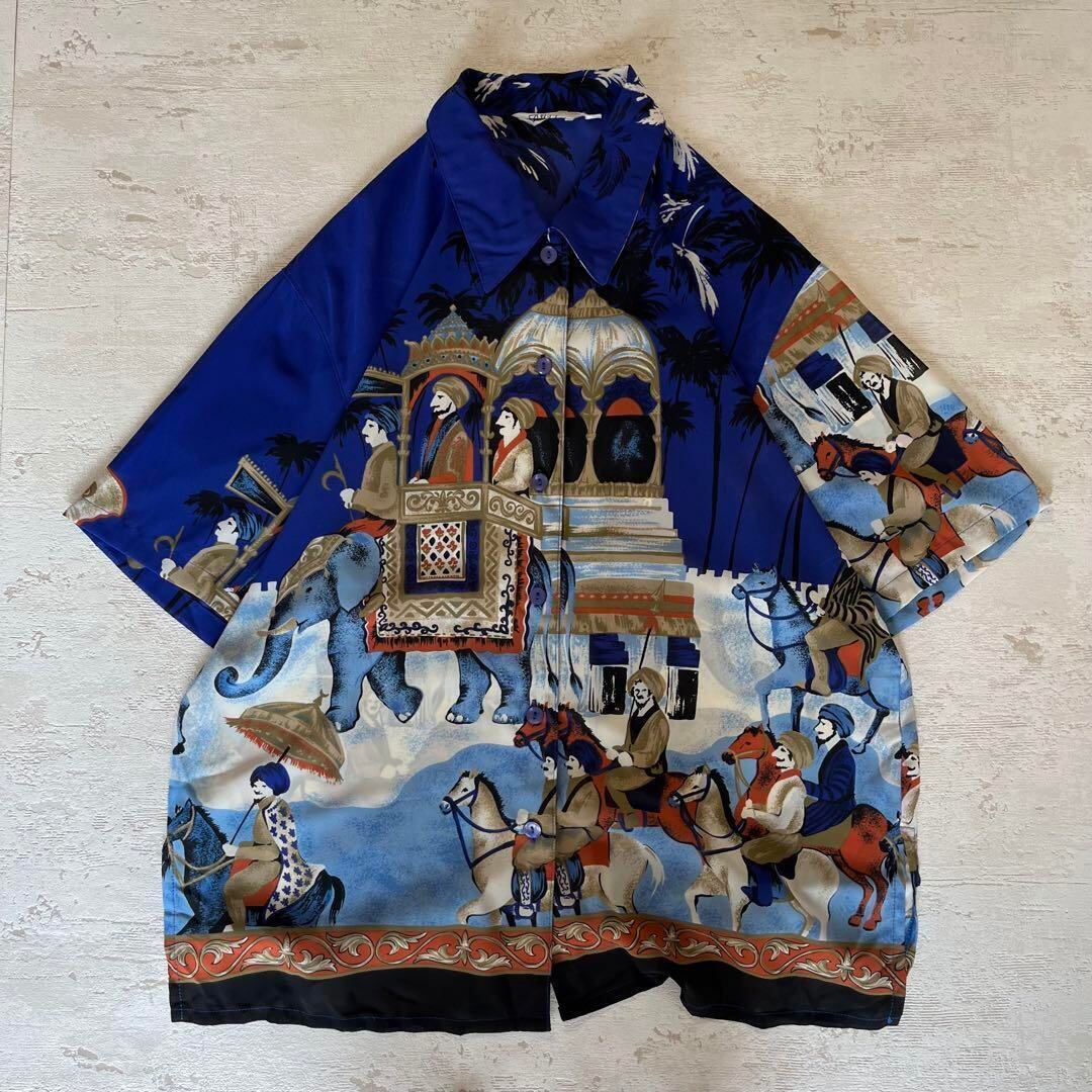 昭和レトロ行商風デザイン半袖シャツブラウスアロハシャツブルー11号ac