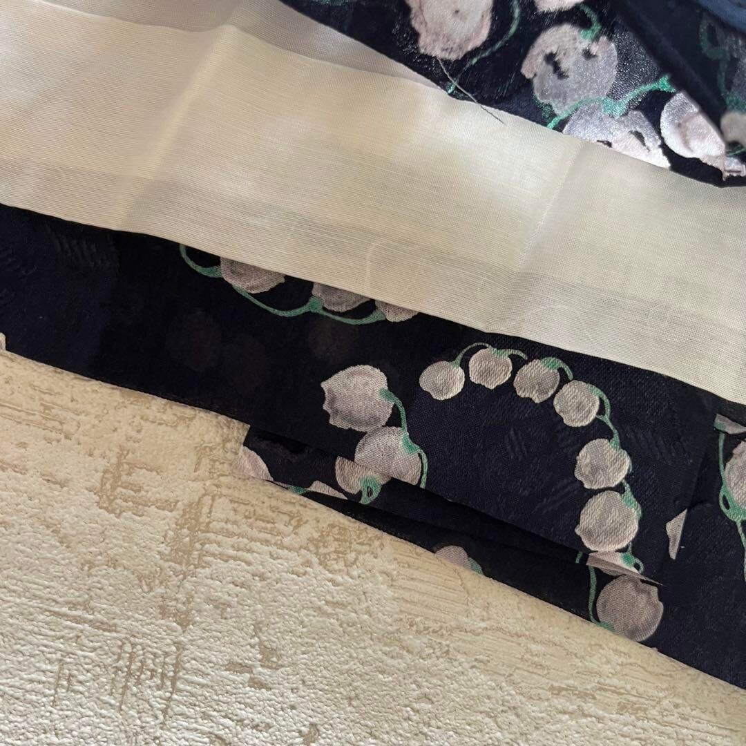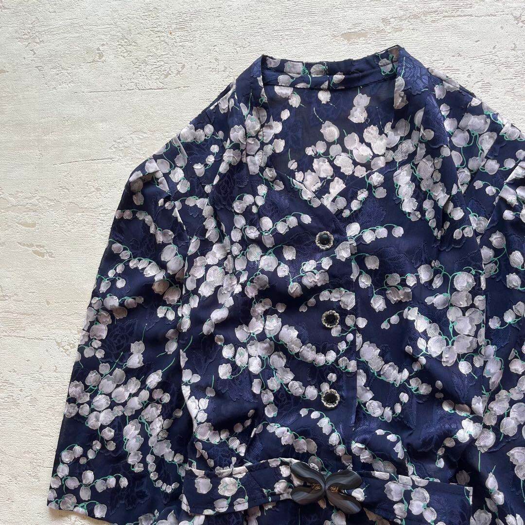 昭和レトロすずらん柄半袖ロングワンピースベルト付きネイビーフリーサイズY1