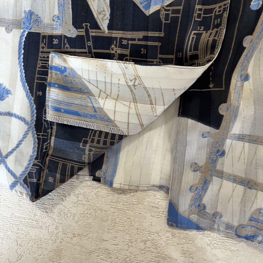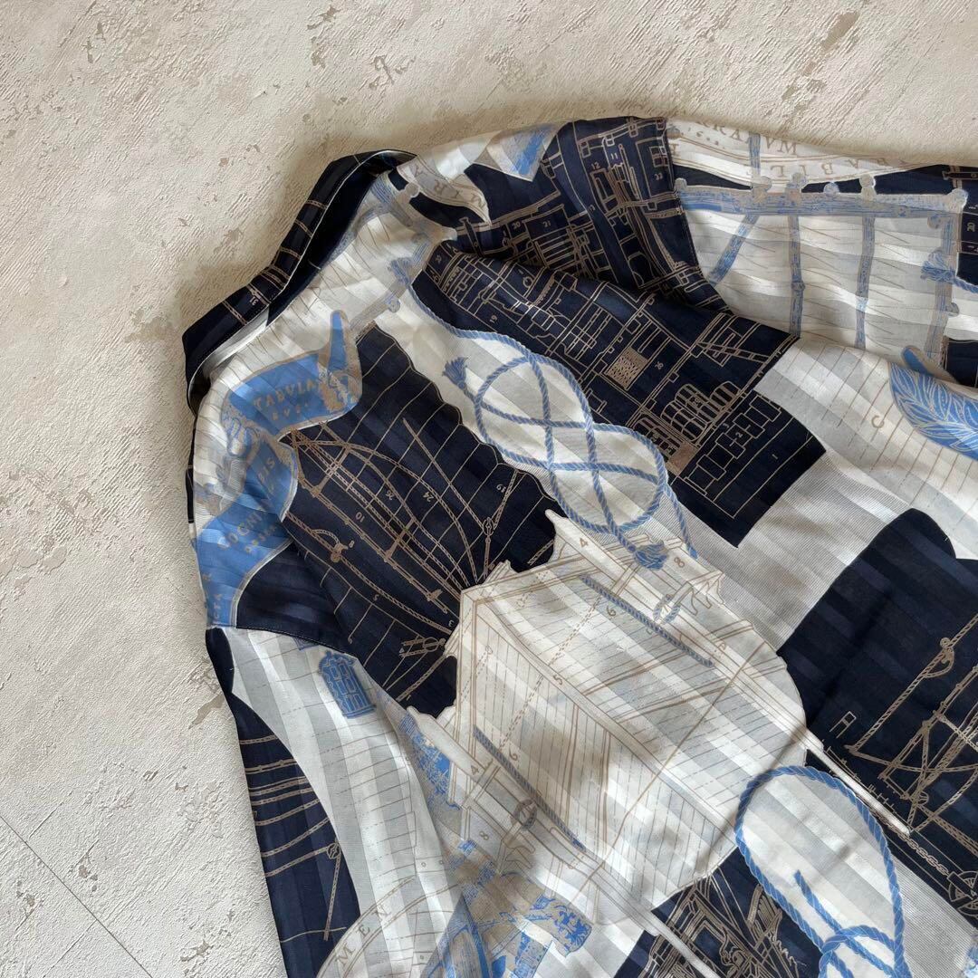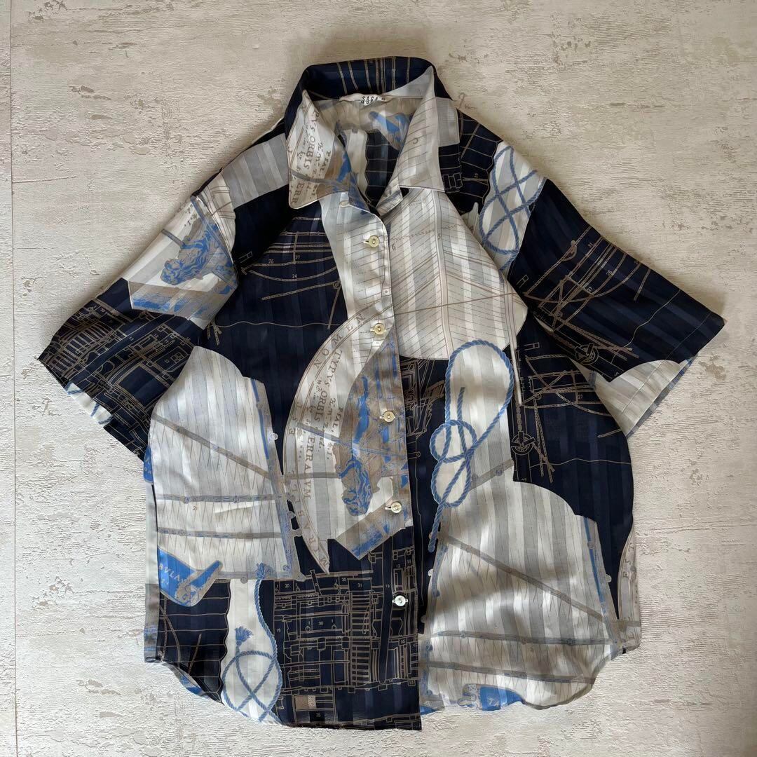 昭和レトロ幾何学模様半袖シャツブラウス透け素材ゆったりネイビーフリーサイズD