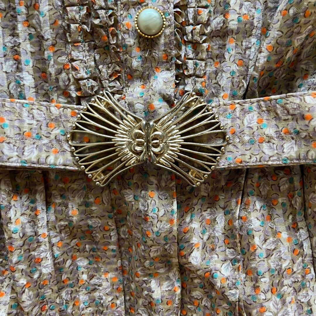 昭和レトロパターン柄半袖ロングワンピースフリルネック透け素材ブラウン11号D