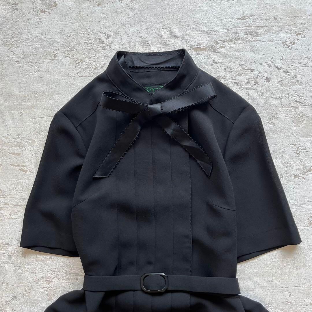 昭和レトロリボン付き半袖ロングワンピースベルト付きフォーマルブラックP1