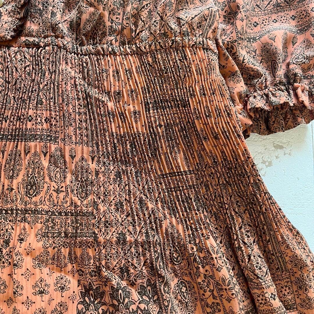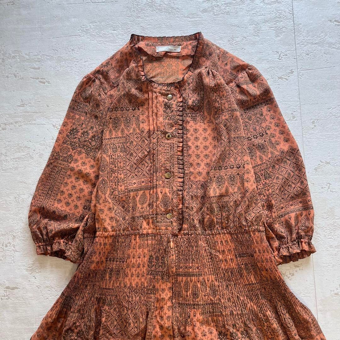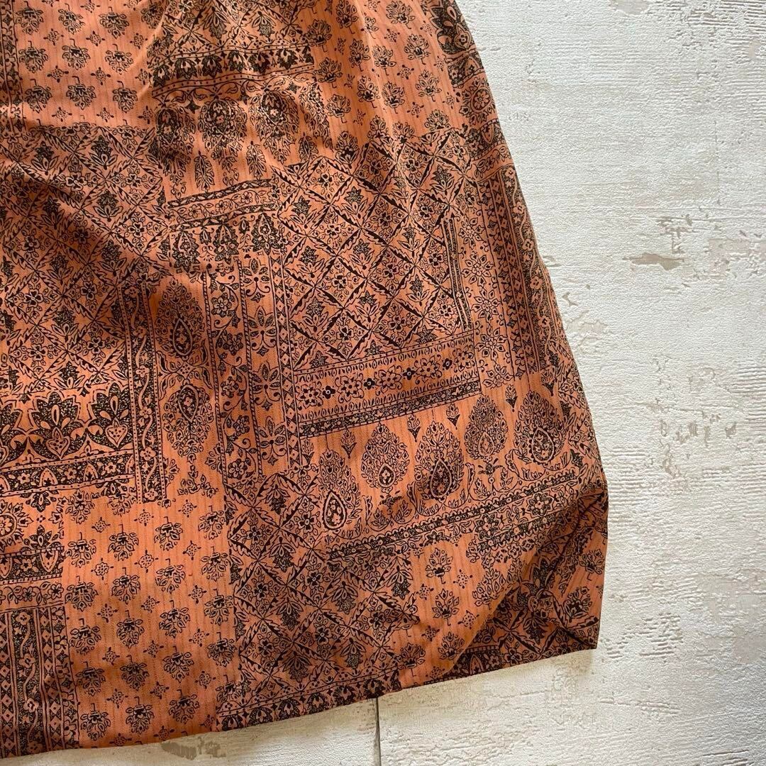 ボヘミアンテイスト漂う、オレンジ系×ブラックの総柄ロングワンピースです。やわらかな生地感で肌触りも良く、ウエストはゴム仕様で着心地ラクラク。七分袖とフロントボタンがアクセントになり、大人可愛い雰囲気を演出します。カーディガンやブーツと合わせたコーデもおすすめ。