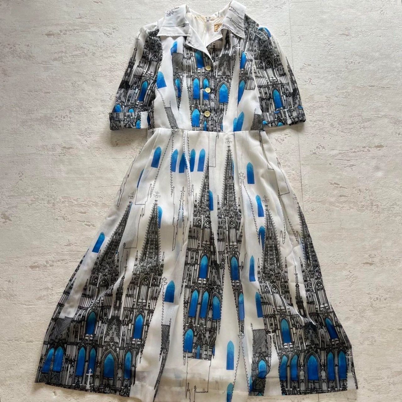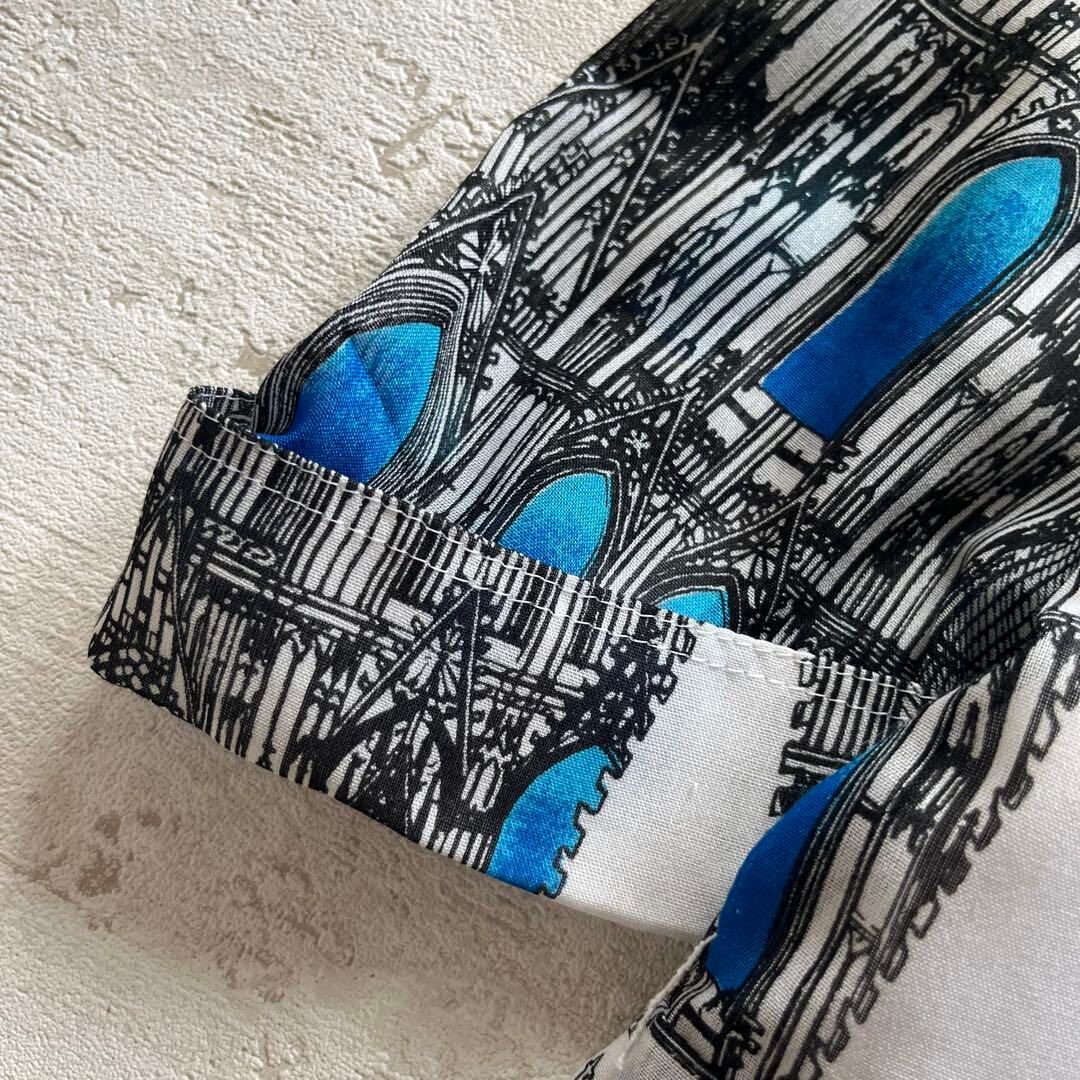 レトロでアート感のある教会建築風プリントが目を引く、個性的な半袖ワンピースです。白地に映えるブルーのステンドグラス風デザインが上品で、他と被らないおしゃれを楽しみたい方におすすめです。