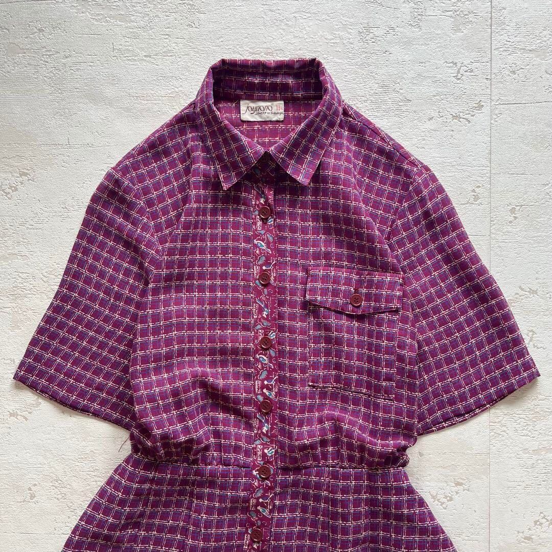 レトロなパープルチェック柄と、小花柄のボタンラインが可愛い半袖シャツワンピースです。ウエストはゴム入りで楽ちん&スタイルアップ効果あり♪さらっとした薄手生地で夏も快適に着用可能◎古着好きさんや一点ものが好きな方にもぴったりな個性派アイテムです。ロング丈なので1枚でコーデ完成!