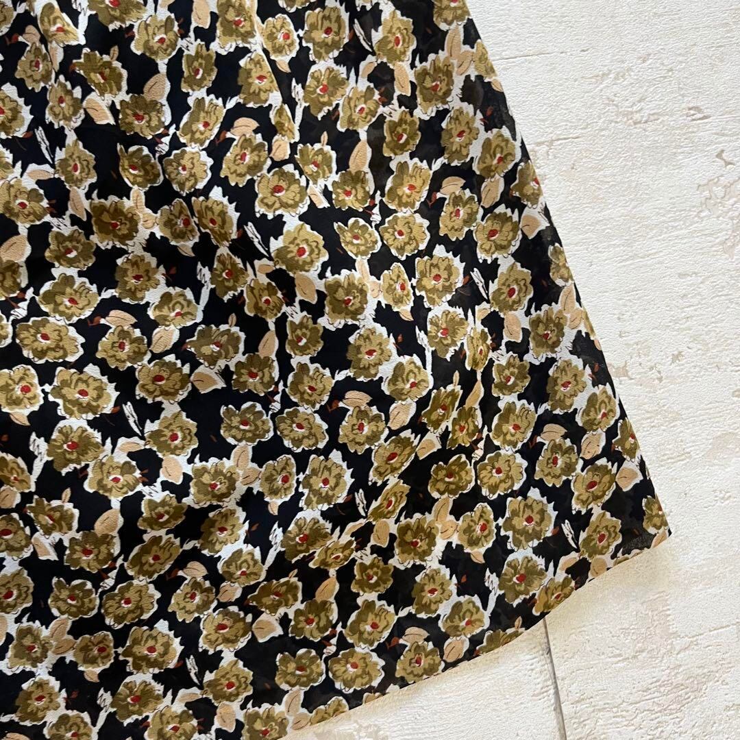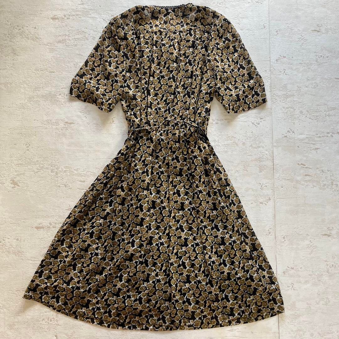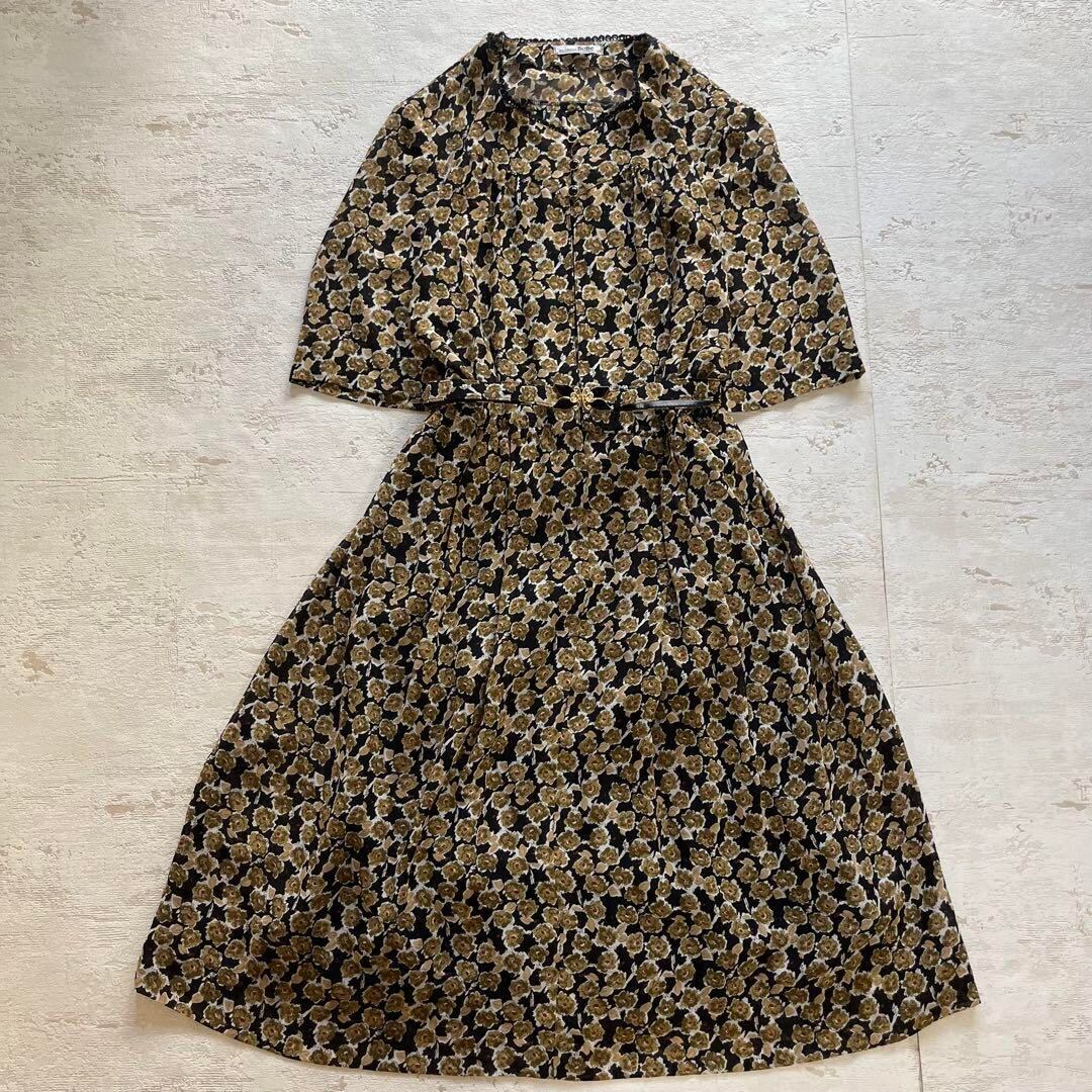 レトロな雰囲気漂う花柄ワンピースです。黒ベースにベージュ系の小花柄が映え、可愛さと大人っぽさを両立。蝶モチーフのウエストベルト付きでスタイルアップ効果も◎。軽やかな素材感で春・夏・秋のロングシーズン活躍します。前ボタン仕様で着脱もしやすく、1枚でコーデが決まる便利アイテム。