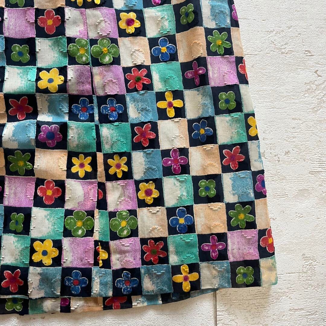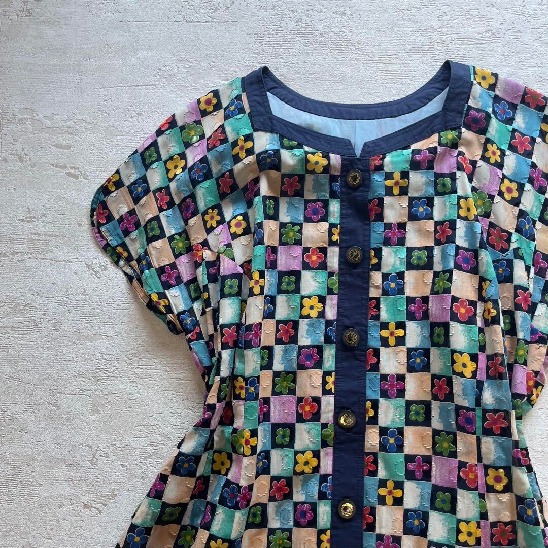 カラフルなチェック柄に小花モチーフが可愛い、ゆったりシルエットのロングワンピースです。前ボタン仕様で羽織りとしても使えて便利!