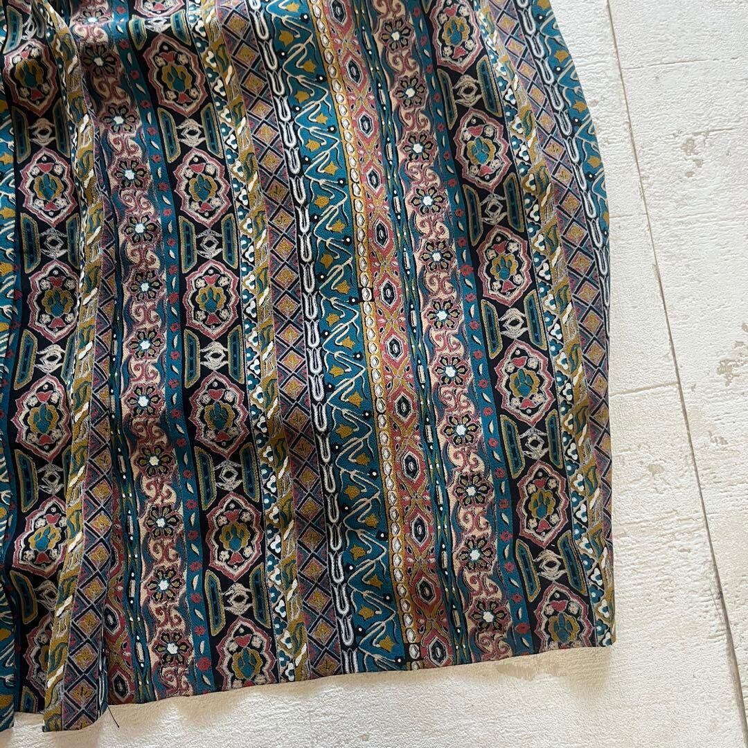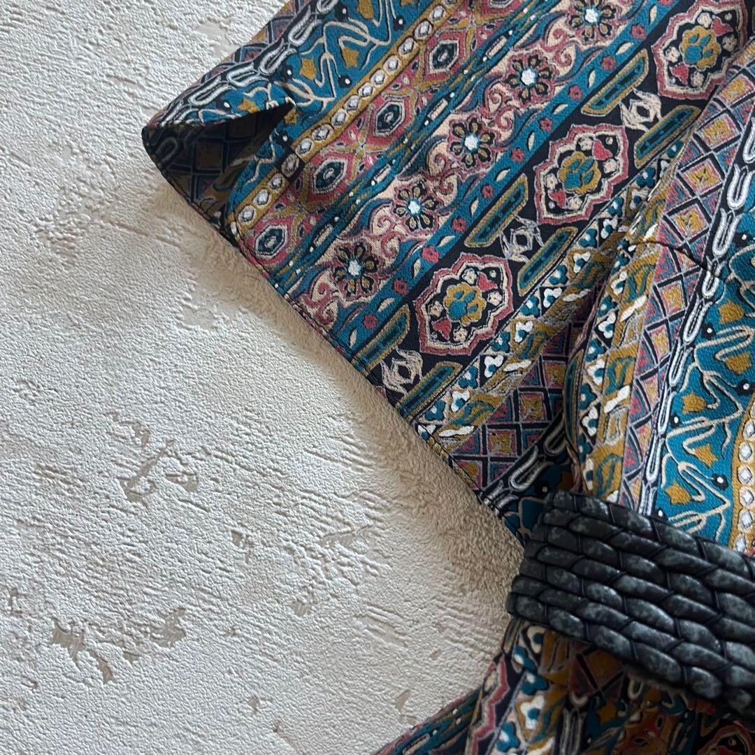レトロな雰囲気が魅力の幾何学×花柄プリントのワンピースです。深みのあるカラーリングと民族調デザインが、1枚でおしゃれに決まるアイテム。ゆったりしたシルエットにウエストベルト付きで、スタイル良く見えるのも嬉しいポイント。柔らかな生地感で動きやすく、秋冬はタートルとの重ね着もおすすめ◎古着やエスニックコーデが好きな方にもぴったりな一着です。