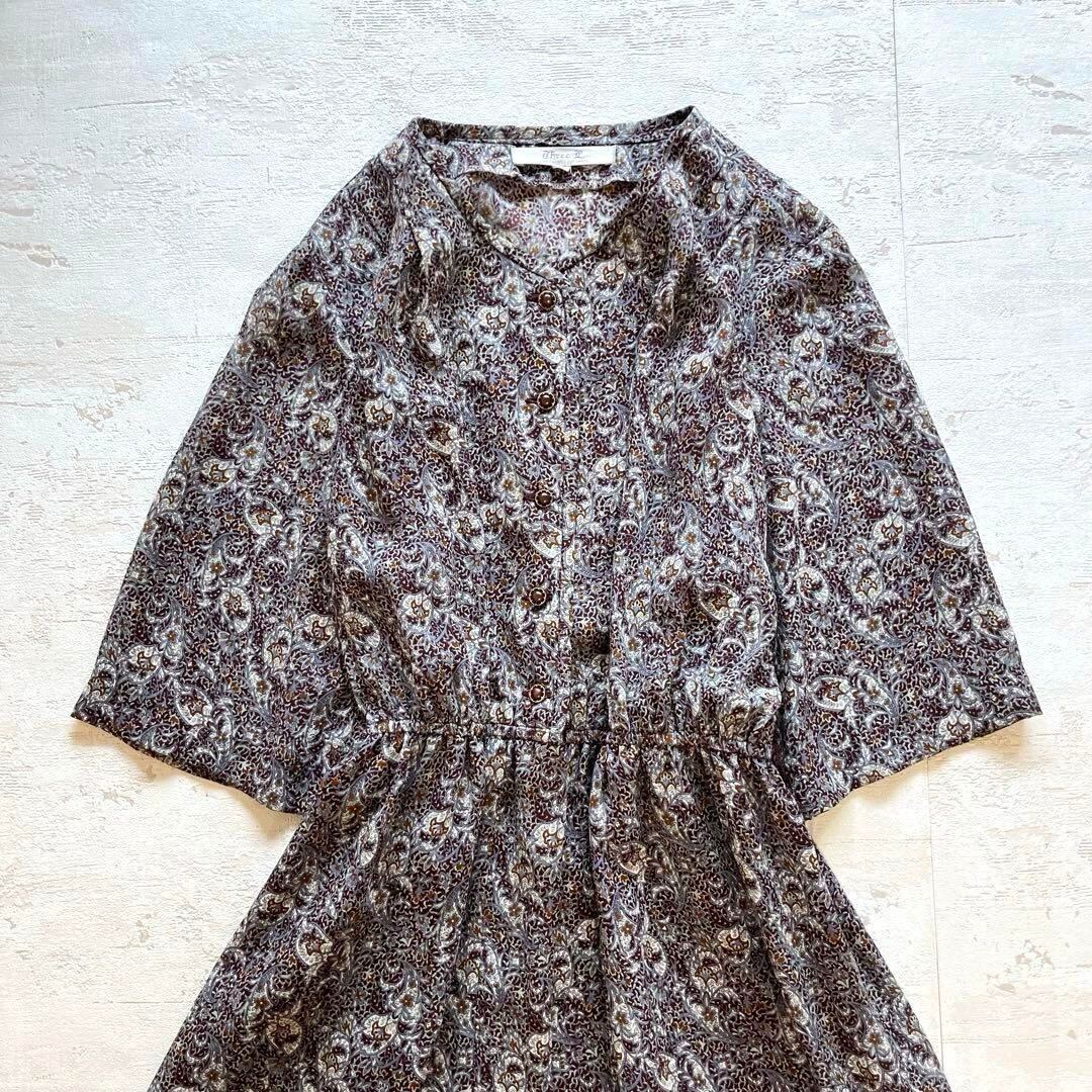 落ち着いたブラウン地に、ピンクやラベンダーのローズ柄が映える華やかなワンピースです。胸元のピンタックデザインとくるみボタンがクラシカルな印象。共布のベルト付きで、ウエストマークもできるのでスタイルアップ効果も◎。スカート部分はフレアで動きがあり、デートやお出かけにぴったりの一枚です。季節の変わり目や秋冬コーデにもおすすめ。目立った汚れなく、まだまだ着ていただけます。
