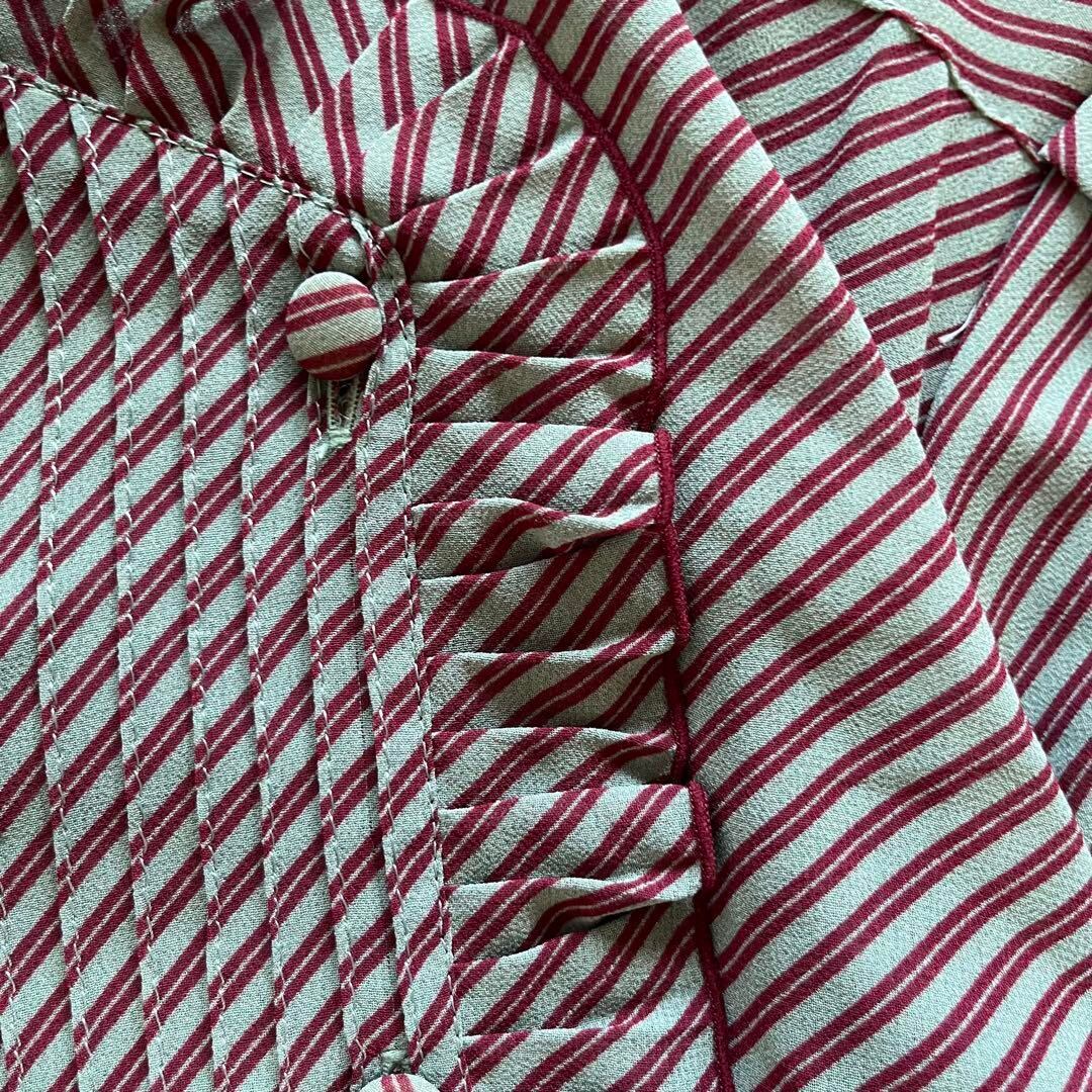 ヴィンテージ感漂う斜めストライプ柄が魅力の上品ワンピース。ボルドー×ベージュの落ち着いた配色で、秋口のコーデにもぴったりです♪襟元のさりげないフリルや共布ボタンがアクセントになり、大人可愛いスタイルが叶います。ウエストゴムでラクなのにしっかり細見え◎デートやカフェ巡り、女子会などお出かけにも活躍する一枚です。きれいめにもカジュアルにも着まわせます♡