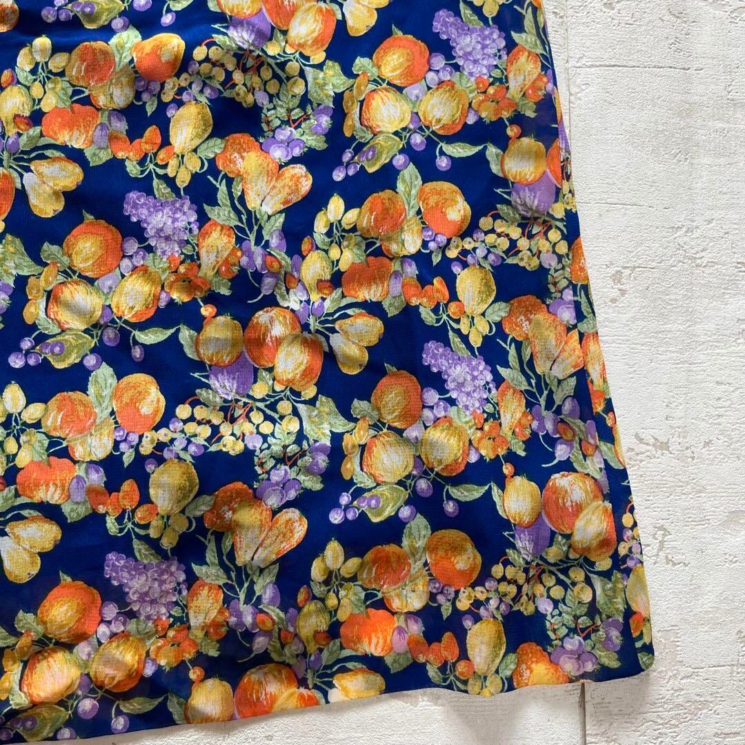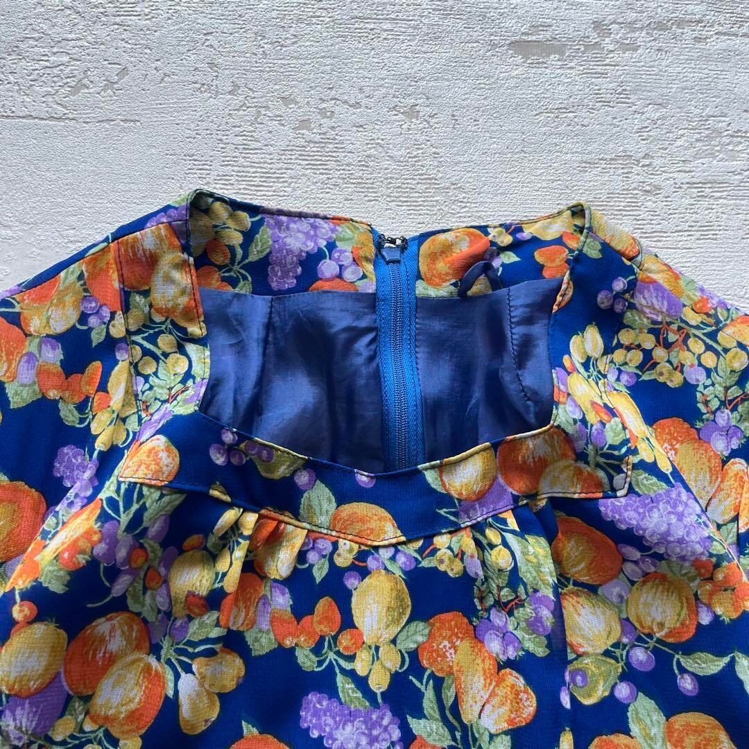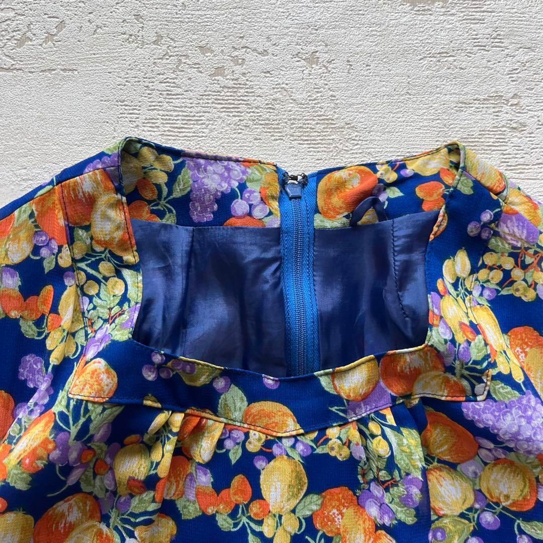 鮮やかなネイビーブルー地にオレンジやパープルのフルーツ柄が映える、20代女性におすすめのレトロ可愛いロングワンピースです。半袖で夏らしく、ウエストベルト付きなのでシルエットを綺麗に見せてくれます。裏地付きで透け感を気にせず着用可能。軽やかな素材感で、デートやカフェ巡り、旅行コーデにもぴったり。派手すぎない柄なので普段使いもしやすく、写真映えも抜群です。ヒールやサンダル、スニーカーとも相性◎。ヴィンテージ好きや個性派ファッションが好きな方にもおすすめの一着です。