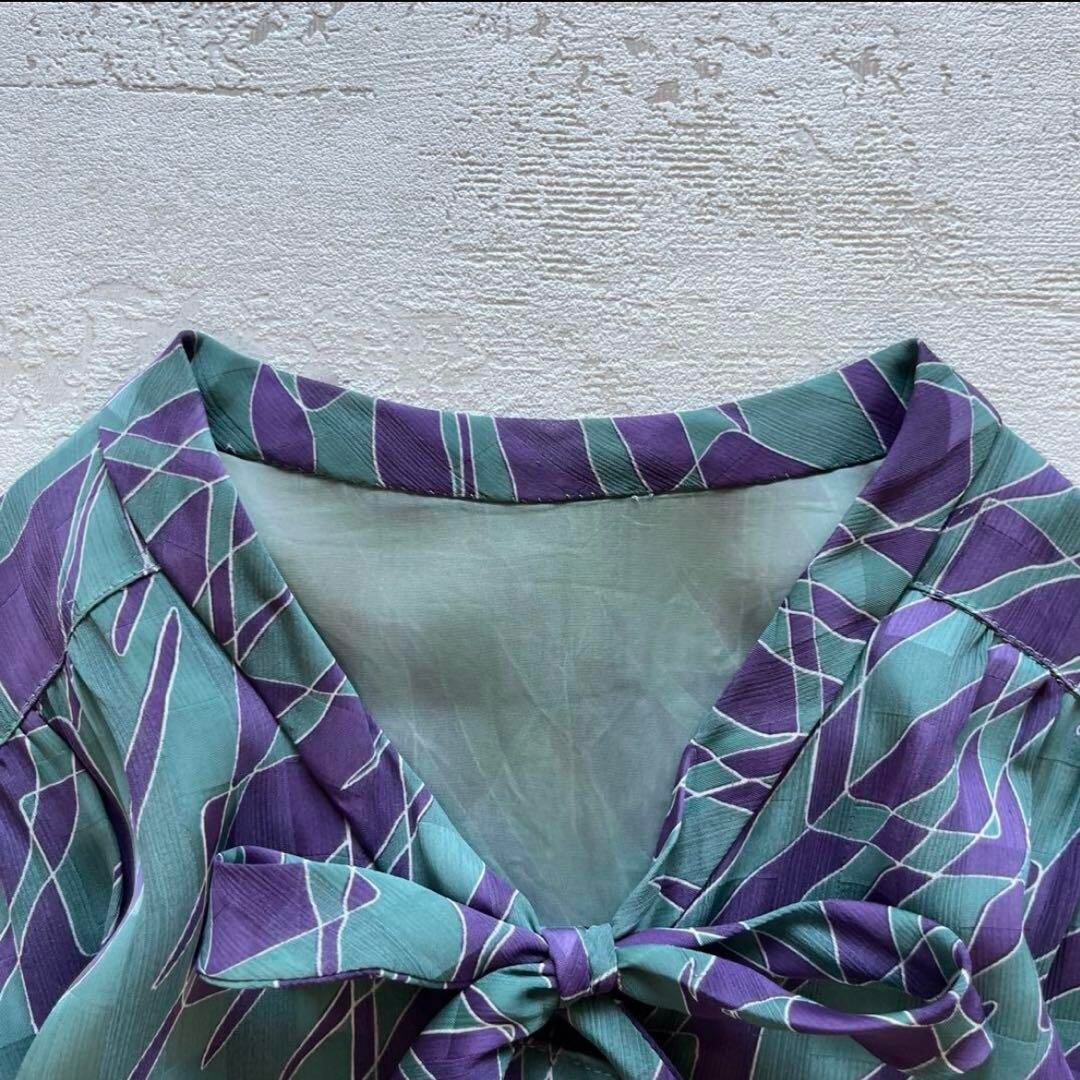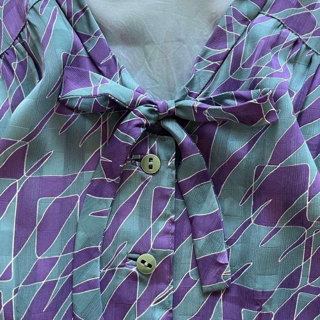 昭和レトロな雰囲気たっぷりの、緑×紫の幾何学柄ワンピースです。首元にはボウタイリボンがあしらわれ、クラシカルで上品な印象に。さらりとした軽やかな生地感で、夏から秋にかけて快適に着用できます。ゆったりとしたシルエットとミディ丈で、体型カバーにも◎。ヴィンテージ感のある色使いと個性的な柄が、他にはない存在感を演出します。お出かけやデイリー使いはもちろん、レトロコーデ好きな方や古着ファッションにもおすすめです。