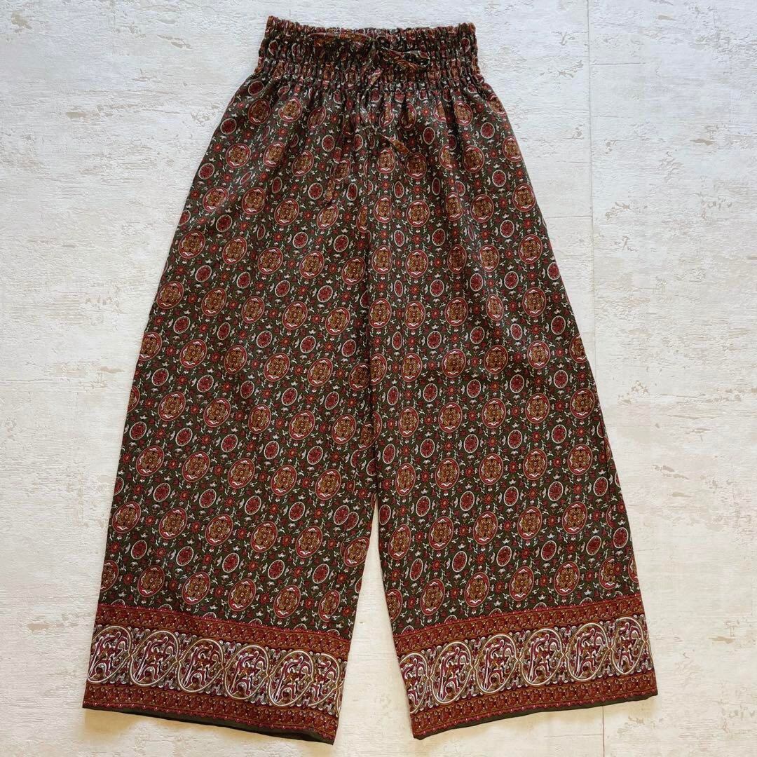 エスニックな総柄プリントが目を引くワイドパンツです。裾部分のボーダー切替デザインがアクセントとなり、コーディネートを華やかに仕上げます。ウエストは総ゴム仕様で、紐調整も可能。締め付け感がなくリラックスして着用でき、長時間のお出かけや旅行にもぴったりです。ゆったりとしたシルエットで体型カバー効果も◎。秋冬コーデの差し色としても活躍し、チュニックやニットとの相性抜群。おしゃれなアジアン・ボヘミアンスタイルを楽しみたい方におすすめの一着です。