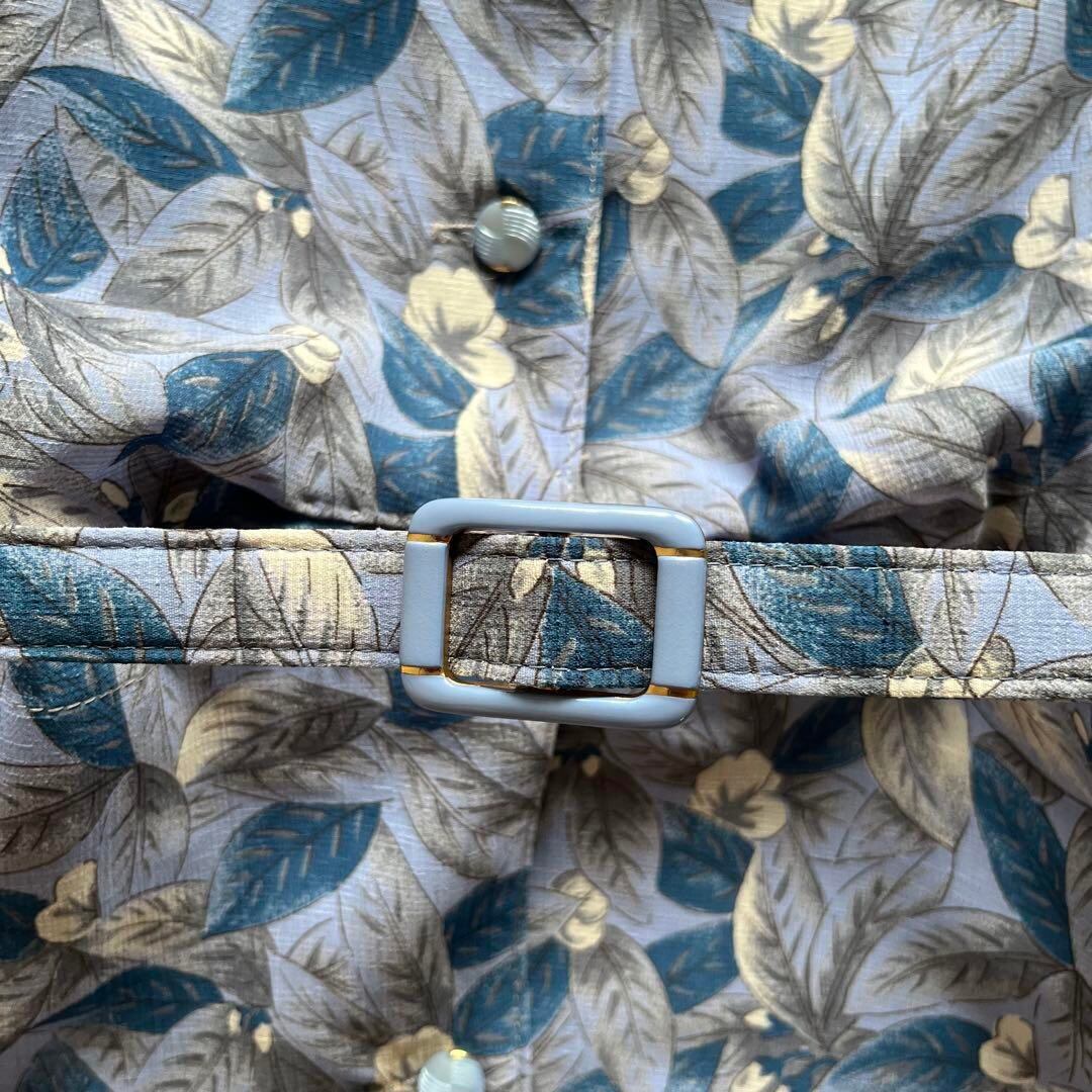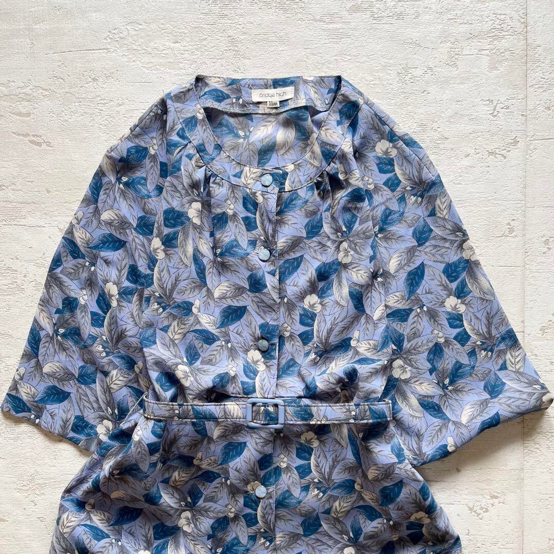 昭和レトロ・ヴィンテージ感漂う、ブルー系を基調としたリーフ柄ロングワンピースです。爽やかな色合いと自然モチーフの総柄が、ナチュラルでフェミニンな雰囲気を演出。共布ベルトでウエストマークすれば、すっきりとしたシルエットに。軽やかな半袖と柔らかな生地感で、春夏は一枚で、秋口はカーディガンやジャケットとのレイヤードにもおすすめ。撮影やお出かけ、デイリーコーデにも映える一着です。