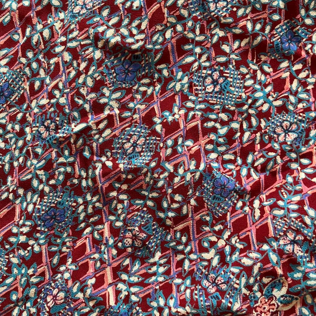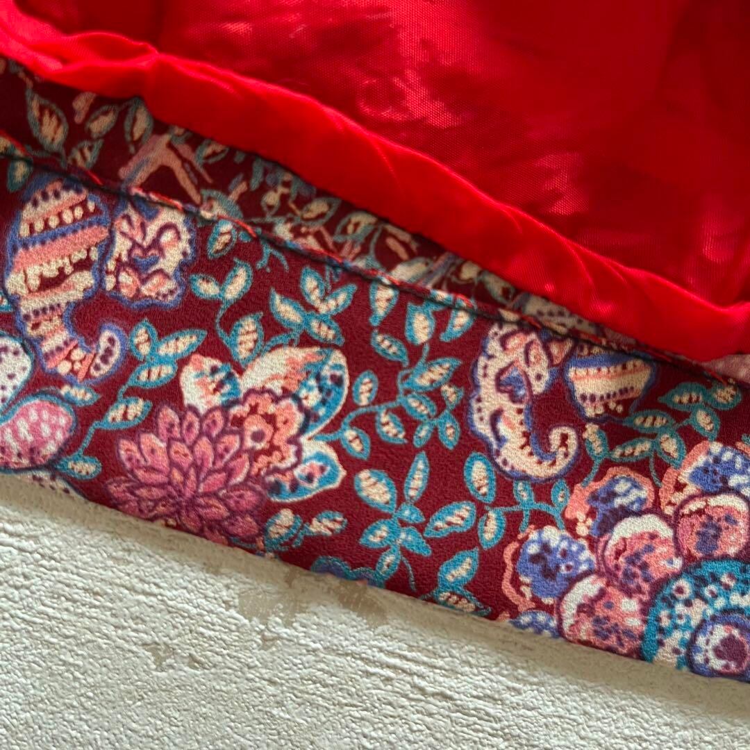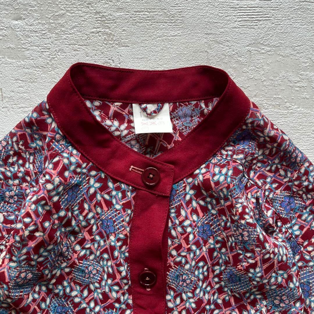 昭和レトロ・ヴィンテージ感漂う、幾何学模様と花柄を組み合わせた個性派ロングワンピースです。ボルドーのスタンドカラーと前立てがデザインを引き締め、付属の共布ベルトでウエストマークすればスタイルアップ効果も◎。軽やかな半袖と柔らかな生地感で、春夏から秋口まで活躍します。デイリーコーデはもちろん、イベントや撮影用コーデにも映える一着。古着らしい一点物の雰囲気をお楽しみください。