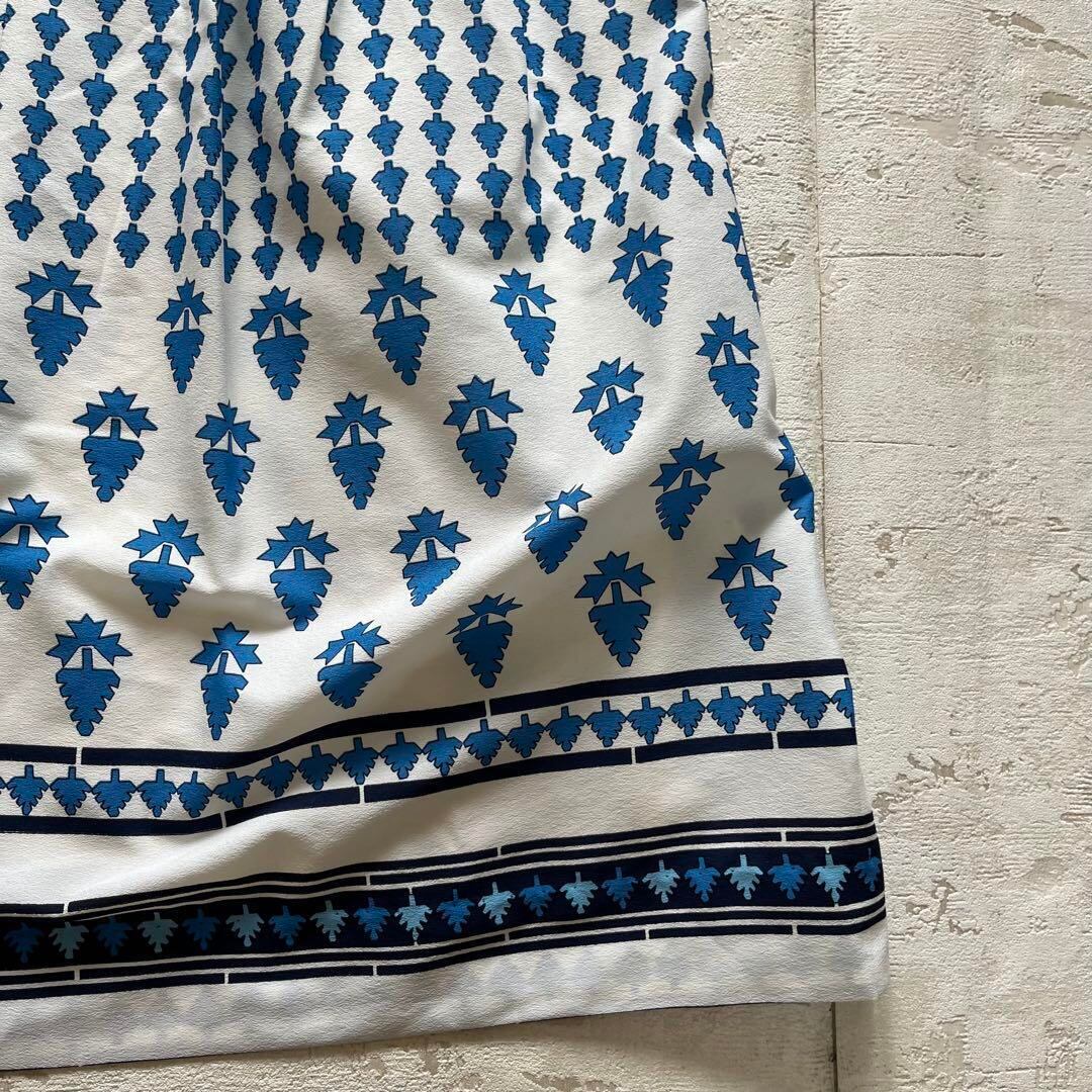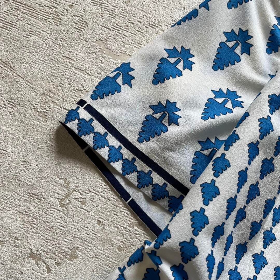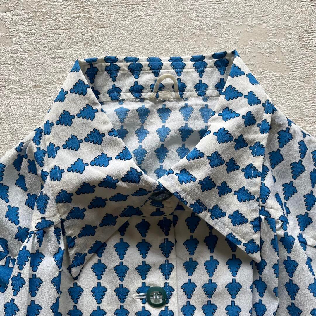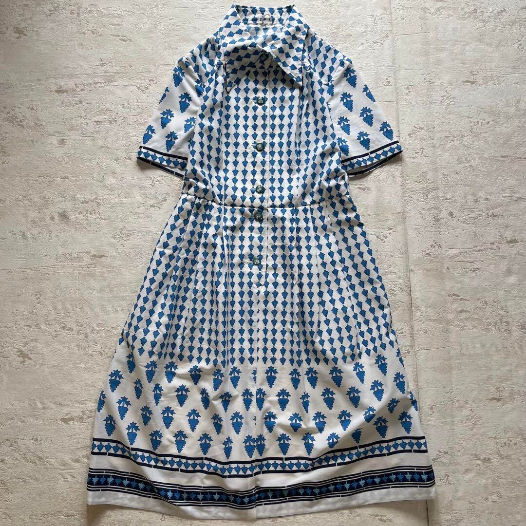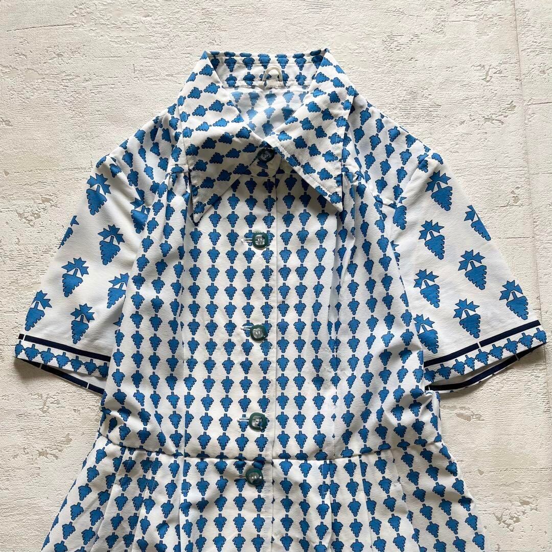 爽やかなブルーとホワイトのコントラストが映える、昭和レトロな半袖ワンピースです。全体に散りばめられたリーフ柄と、襟・袖・裾の切替デザインがポイント。前ボタン仕様で着脱しやすく、ウエスト切替で女性らしいシルエットを演出します。綿混素材で肌触りも軽やか、夏から初秋まで快適に着用可能。ヴィンテージ好きやレトロコーデ好きの方にもおすすめです。普段着はもちろん、お出かけやイベントにも映える一着です。