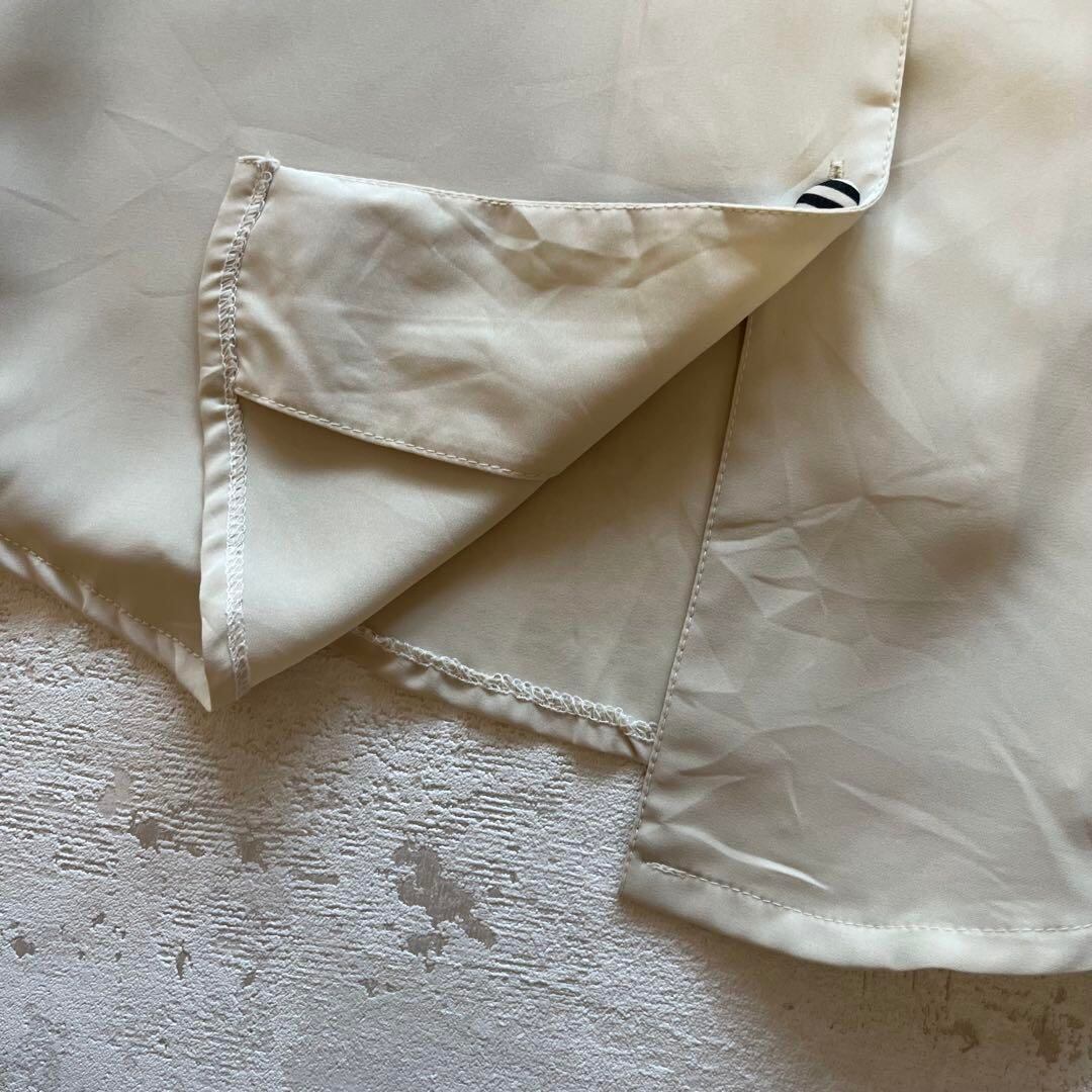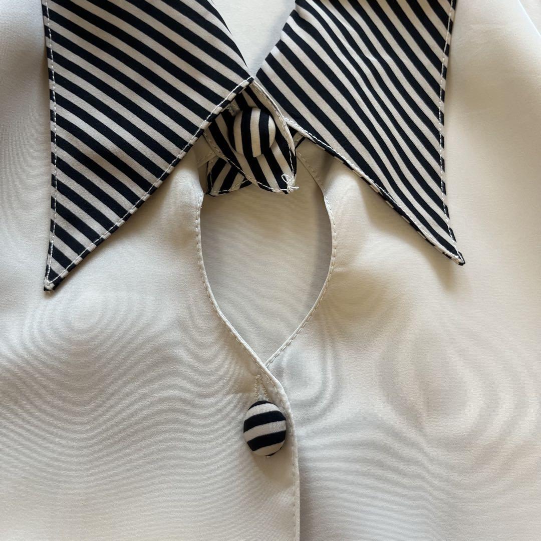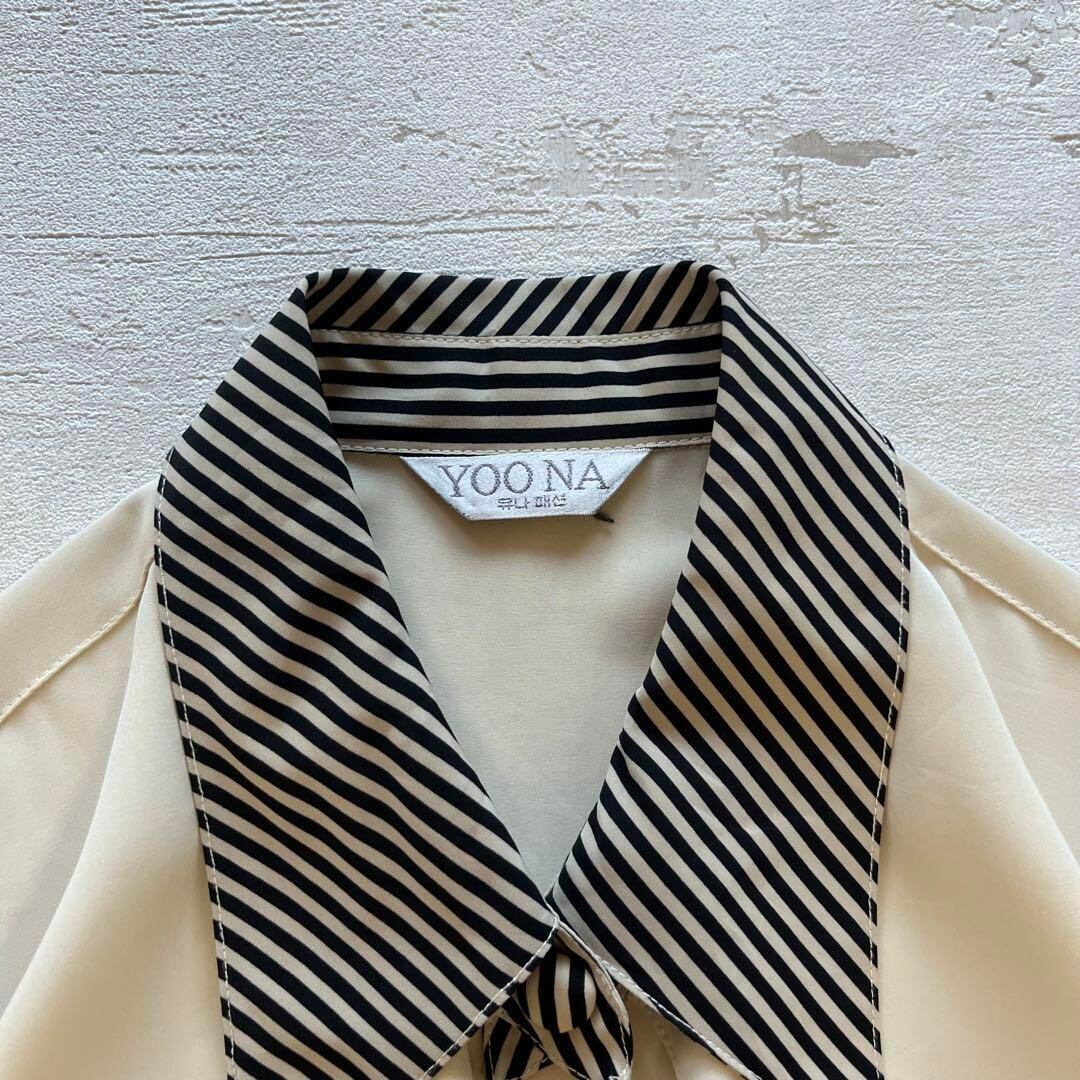 デザインシャツです。ベージュの本体に、ブラック×ホワイトのストライプ柄が襟・袖口・ボタンに施された個性的な一枚。大きめの襟がレトロモードな雰囲気を演出し、シンプルながら存在感があります。程よい光沢感のある生地で着心地も良く、カジュアルにもきれいめにも合わせやすいデザイン。デニムやスカートと合わせればおしゃれに決まり、オフィスカジュアルからお出かけコーデまで幅広く活躍します。韓国ファッションやヴィンテージスタイルが好きな方におすすめです。