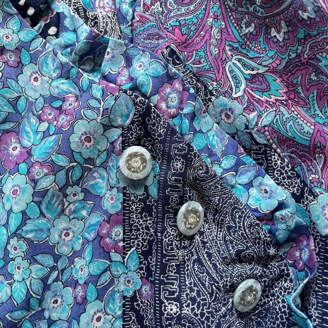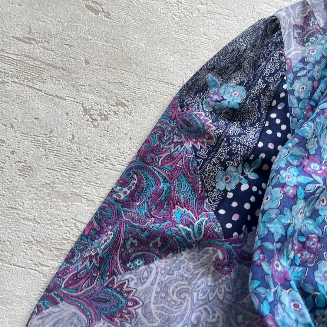 昭和レトロ感漂う個性派ワンピースです。ブルーやパープルを基調とした花柄とペイズリー柄の切替デザインに、水玉ドットのリボンベルトがアクセントになり、華やかで目を惹く一枚。ウエストはリボンで調整でき、シルエットをすっきり見せてくれます。長袖なので秋冬シーズンにも着やすく、古着コーデやヴィンテージスタイル、イベントにもおすすめ。1枚で存在感があり、カーディガンやブーツとの相性も抜群です。レトロファッションや個性派アイテムがお好きな方にぜひどうぞ。