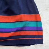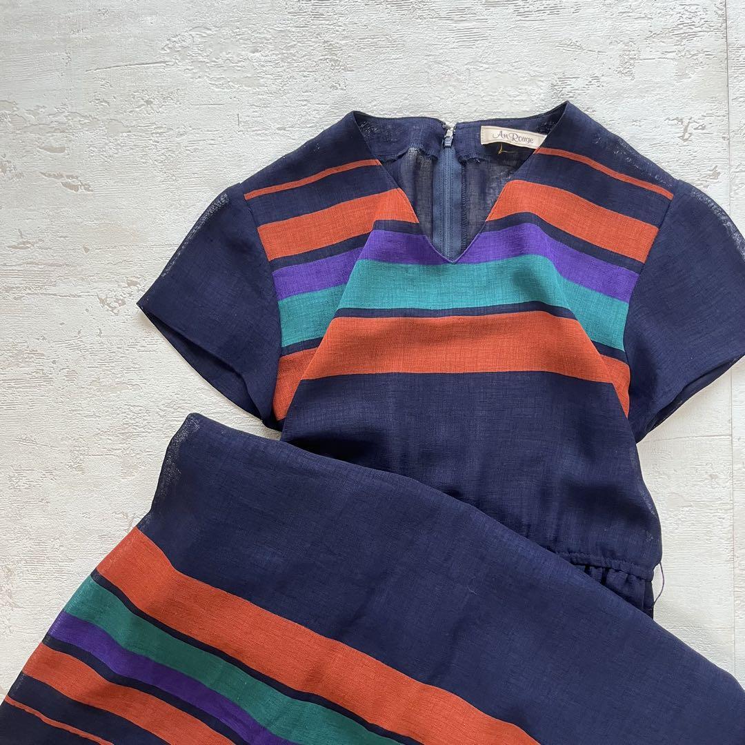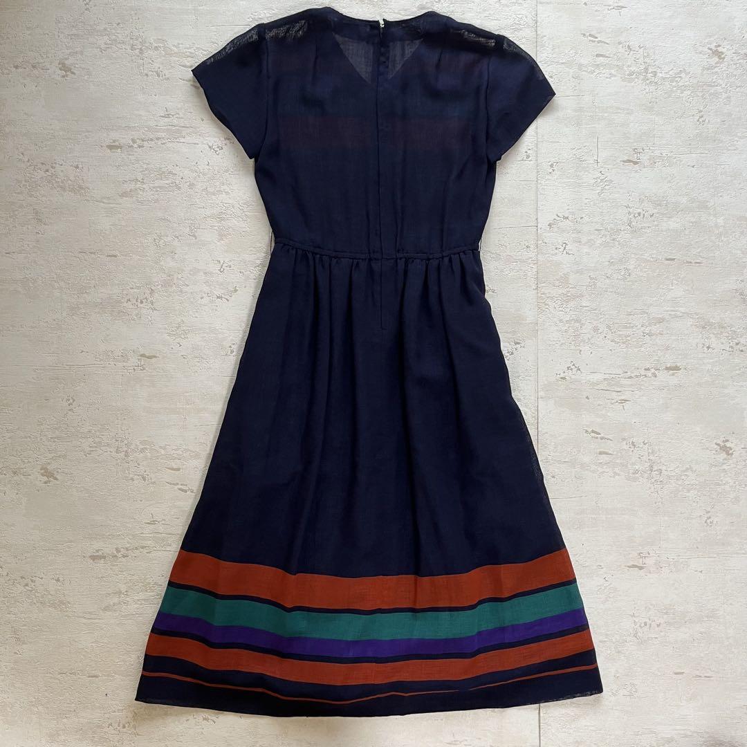 昭和レトロ感漂うネイビー基調のワンピースです。胸元と裾に配された赤・緑・紫のカラフルなボーダー柄が目を引くデザイン。ウエストは軽くシェイプされ、ふんわりと広がるシルエットで女性らしい雰囲気を演出します。さらりとした生地感で夏から秋にかけて快適に着用でき、ちょっとしたお出かけやデイリーコーデにも活躍。レトロモードな雰囲気を楽しみたい方や、人と被らないワンピースを探している方におすすめの一着です。