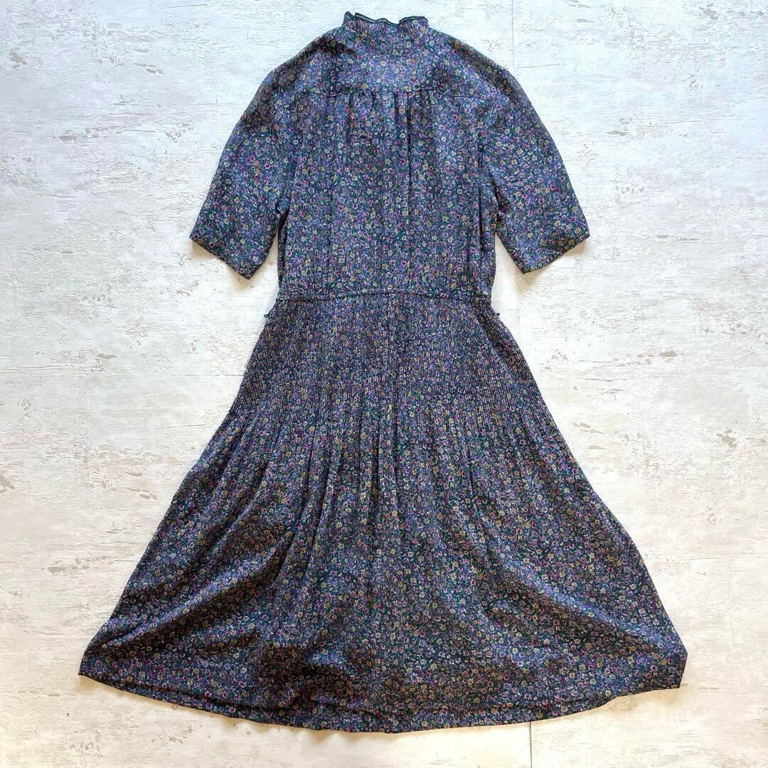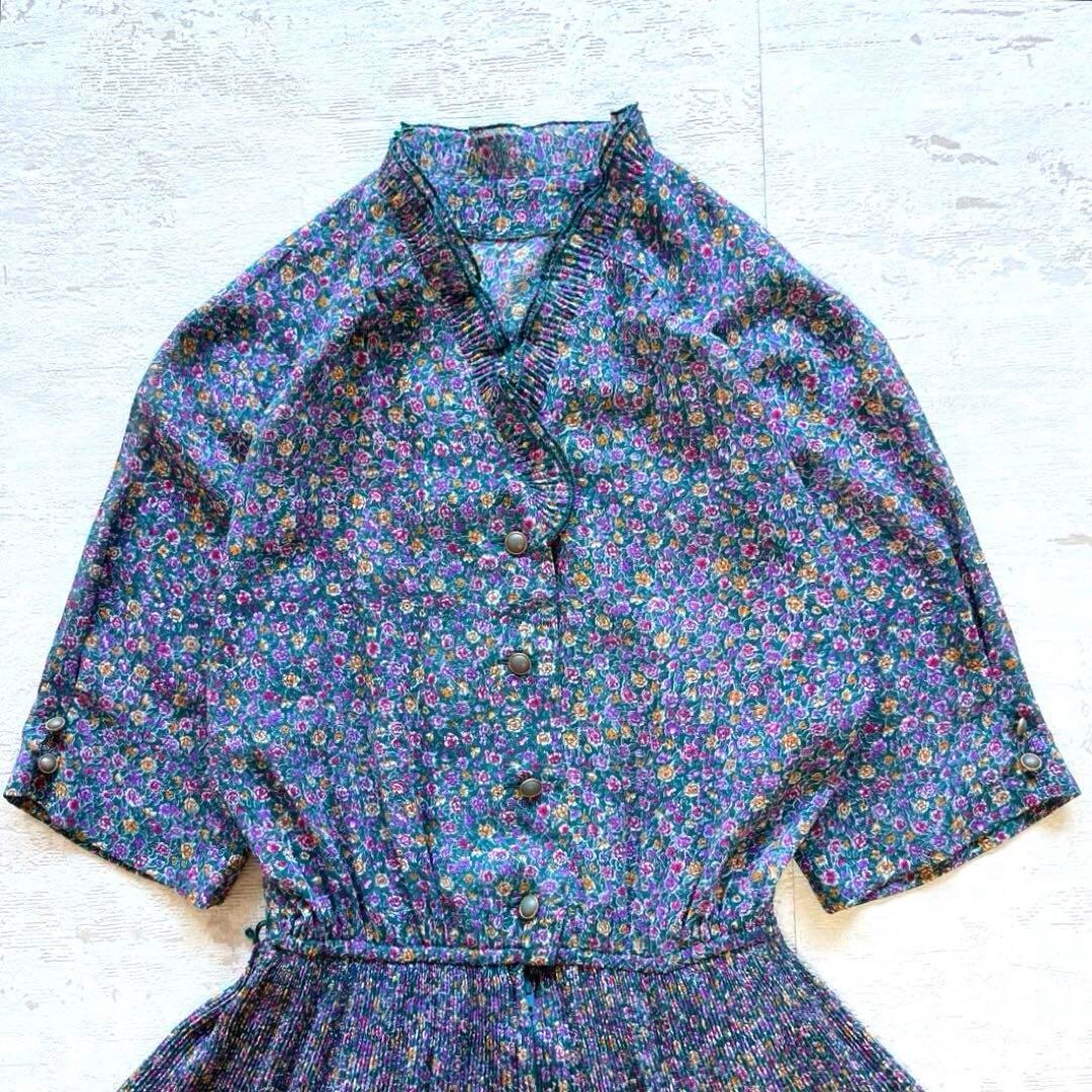 レトロ感漂う花柄の半袖ワンピースです。紫やピンク、イエローの小花模様が全体にあしらわれ、上品で可愛らしい印象。前ボタン仕様で着脱がしやすく、Vネックのデザインがデコルテをすっきり見せてくれます。ウエストはゴム仕様で締め付け感が少なく、自然にシルエットを整えてくれるのも魅力。ロング丈なので一枚でさらっと着ても大人っぽく、カーディガンやジャケットを合わせて秋口まで長く楽しめます。昭和レトロやヴィンテージ好きな方におすすめの一枚です。