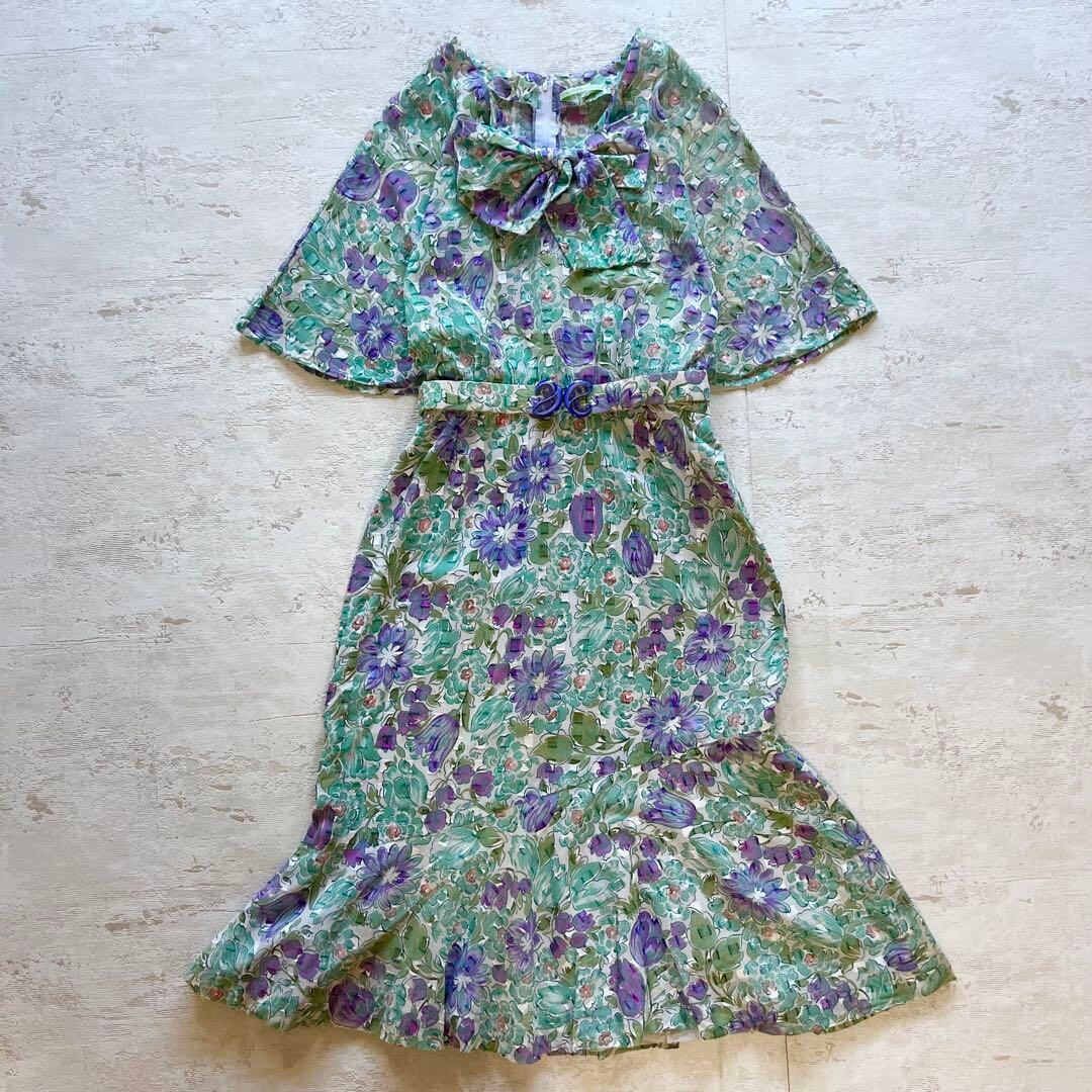 昭和レトロな雰囲気漂う花柄ワンピースです。グリーンをベースにパープルやブルーのフラワープリントが華やかで、1枚で存在感のあるデザイン。大きめのリボンタイがアクセントになり、クラシカルで可愛らしい印象を演出します。付属のベルトでウエストマークすれば、メリハリのあるシルエットに。裾はフレアラインで動きがあり、女性らしさを引き立てます。透け感のある軽やかな素材で夏のお出かけにも快適。レトロファッション好きな方や古着コーデがお好きな方におすすめの一枚です。