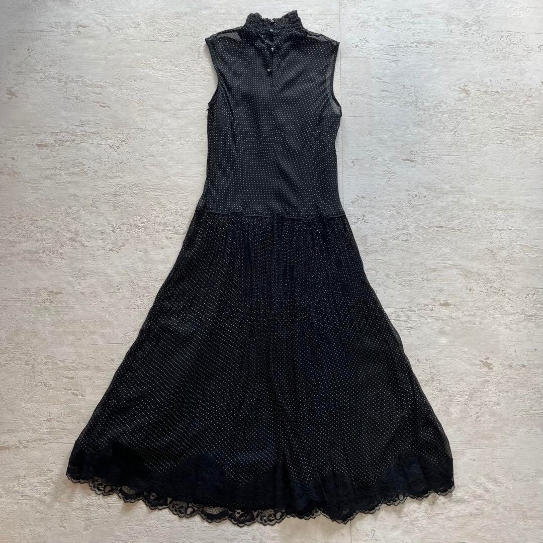 コムサイズム(COMME CA ISM)のノースリーブワンピースです。ブラック地にホワイトの細かいドット柄があしらわれ、クラシカルで上品な雰囲気を演出します。ハイネック部分はシャーリング仕様で華やかさがあり、ウエストリボンでシルエットを美しく整えてくれます。裾には繊細なレースが施されており、動くたびに揺れるプリーツデザインが女性らしさを引き立てます。普段のお出かけからパーティー、フォーマルな場面まで幅広く活躍できる一着です。シーズンレスで着用可能な万能ワンピースをお探しの方におすすめです。