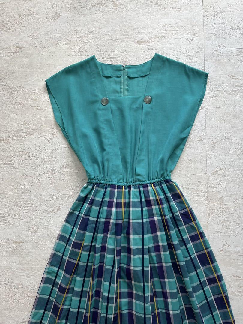 レトロ感あふれるチェック柄のワンピースです。トップス部分は鮮やかなグリーン、スカート部分はブルー×グリーン×ネイビーにイエローをアクセントにしたチェック柄で、目を惹く配色が特徴。ウエストはゴム仕様になっており、リラックス感のある着心地と女性らしいシルエットを両立しています。フロントのボタンデザインもレトロな雰囲気を引き立て、古着好きやヴィンテージファッションを楽しみたい方におすすめ。夏は一枚で、秋はカーディガンを羽織って着回しできるアイテムです。
