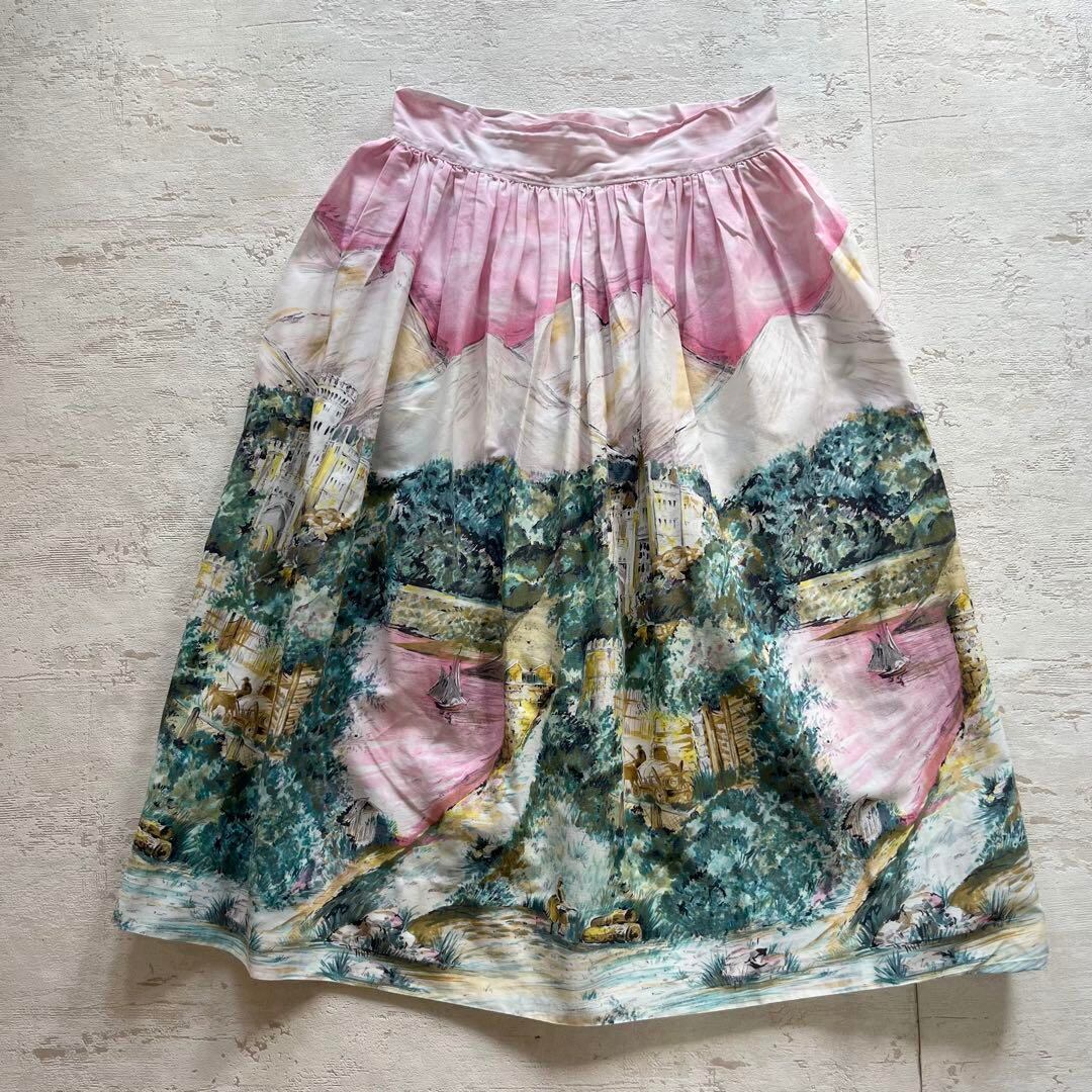 ヨーロッパの風景画を思わせるアート調プリントが魅力的なレトロスカートです。ピンク・グリーン・ブルーを基調とした柔らかな色合いに、建物や森、川辺の情景が描かれたデザインは存在感抜群。まるで絵画を纏うような雰囲気で、シンプルなトップスと合わせるだけでコーデが華やぎます。ウエスト部分はゴム仕様で着脱しやすく、ゆったりとしたフレアシルエットが女性らしい印象を演出。昭和レトロやヴィンテージ好きな方、個性的なおしゃれを楽しみたい方におすすめの一点です。