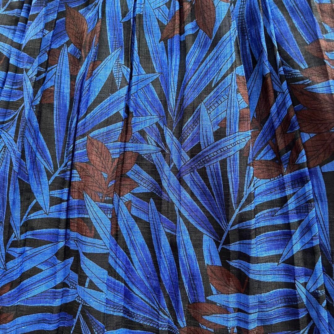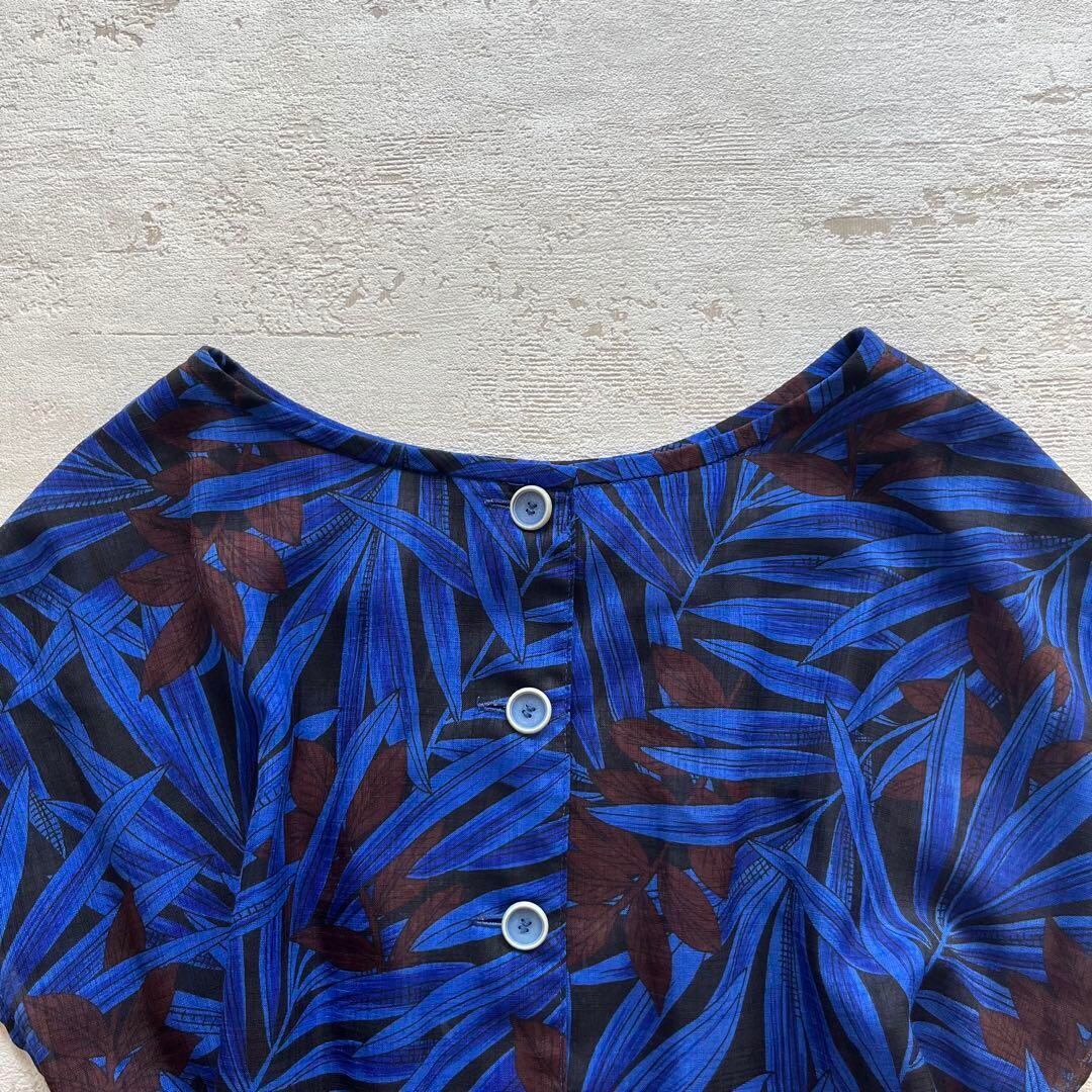 鮮やかなブルーとブラックのリーフ柄が印象的な昭和レトロな半袖ワンピースです。ウエスト部分はゴム仕様になっており、程よいフィット感と着心地の良さを兼ね備えています。広がりのあるフレアシルエットが女性らしさを引き立て、動くたびに美しいラインを演出してくれる一枚。夏のお出かけやリゾートスタイルにはもちろん、古着好きな方やレトロファッションを楽しみたい方にもおすすめです。涼しげなデザインでデイリー使いからイベント、旅行にも幅広く活躍します。