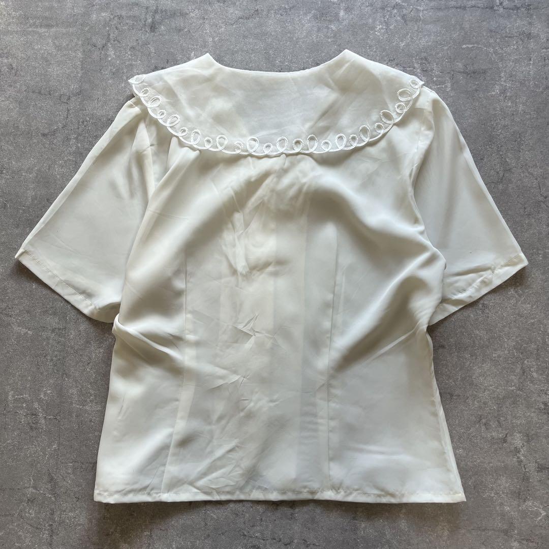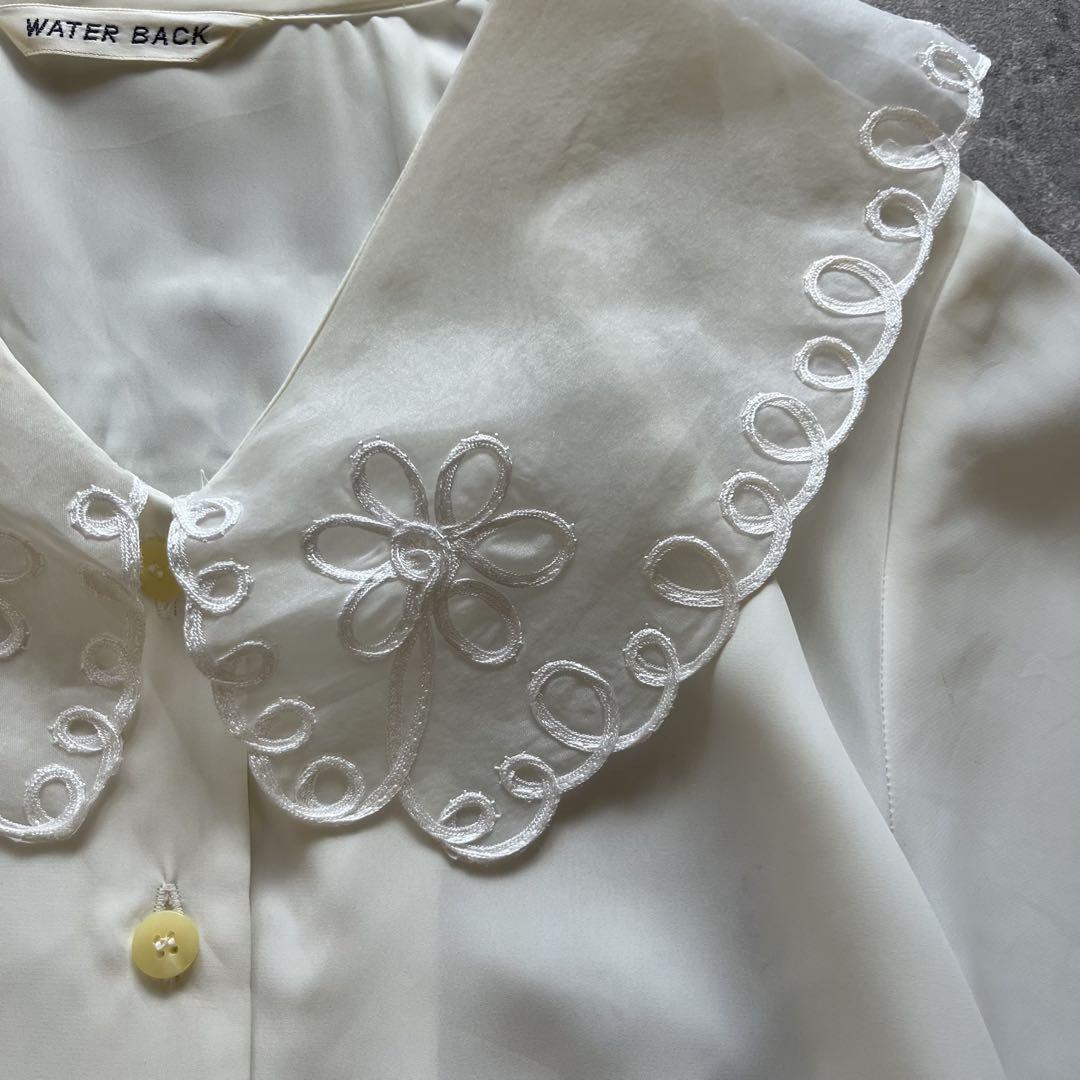 大きな刺繍入りの丸襟が印象的なホワイトの半袖ブラウスです。柔らかい生地感で着心地が良く、シンプルながらもレトロな可愛さを演出できます。前ボタン仕様で着脱も楽々。デニムやスカートに合わせると、ガーリーにもクラシックにもコーディネート可能です。大きな襟の花柄刺繍が顔周りを華やかに見せ、アクセサリーなしでもコーデが完成する万能アイテム。春夏のお出かけ、カフェ巡り、デートにもぴったり。レトロファッションや昭和ヴィンテージ好きな方におすすめの一点です。