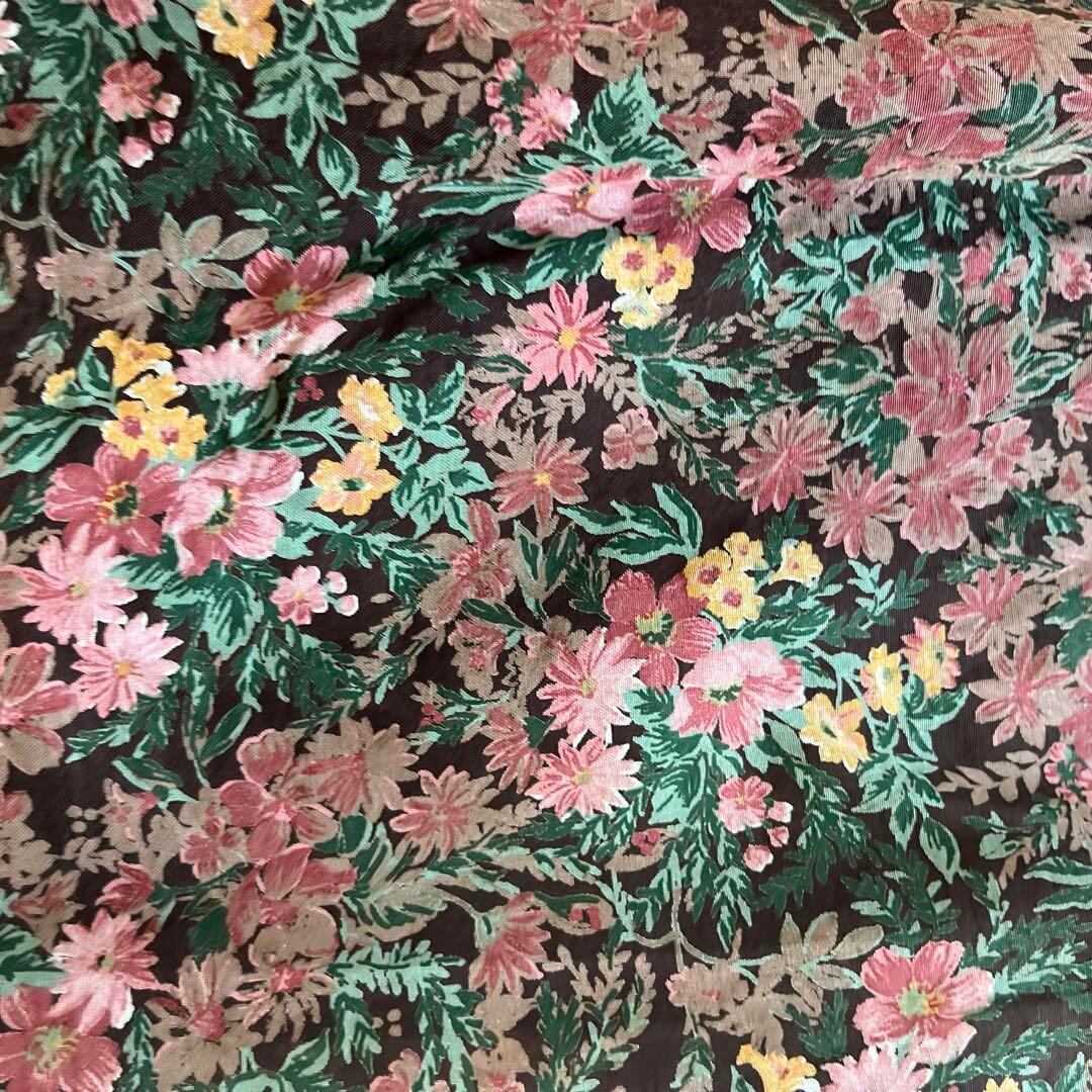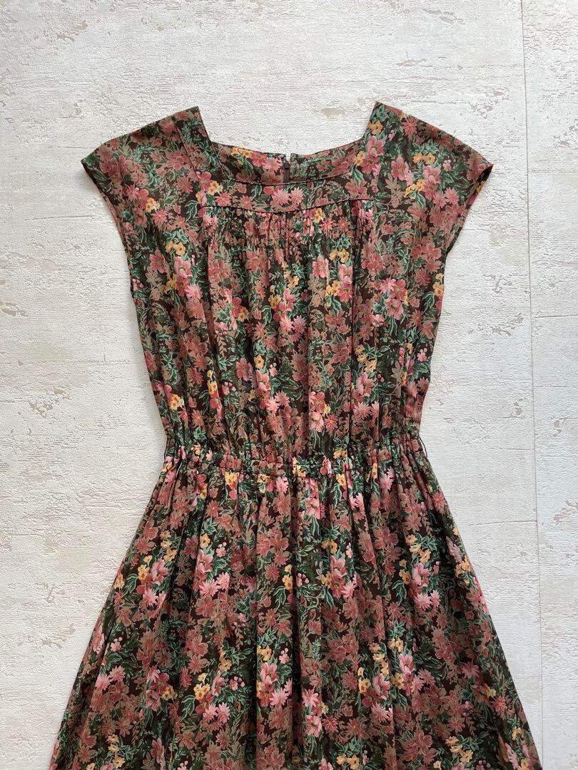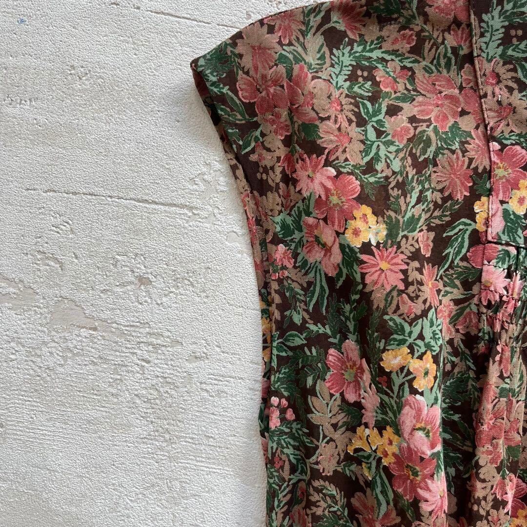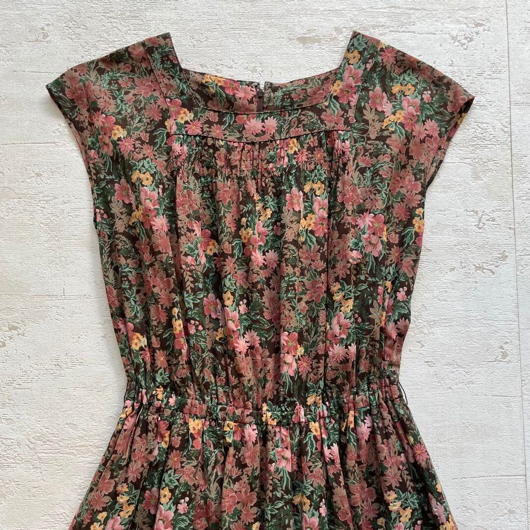昭和レトロな雰囲気漂う花柄ワンピースです。深みのあるブラウンをベースに、ピンクやイエローのフラワープリントが華やかで上品な印象を与えてくれます。ウエスト部分はギャザー仕様で、自然にくびれを演出しながらも着心地は楽ちん。軽やかな素材感で春夏はもちろん、カーディガンやジャケットを合わせれば秋口まで長く楽しめます。ノースリーブ風のデザインはシルエットをすっきり見せ、大人かわいいスタイルにぴったり。ナチュラルコーデやフェミニンコーデにも合わせやすい一枚です。