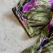 昭和レトロ 花柄 ワンピース ボウタイ付き グリーン 七分袖 ロング丈 J2