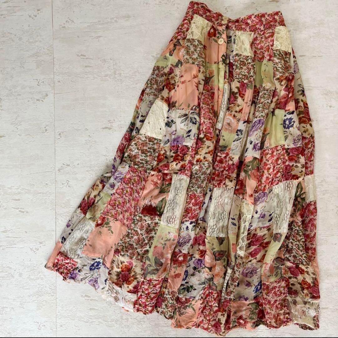 花柄やレースを組み合わせたパッチワーク風のロングスカートです。柔らかな素材感と華やかな色使いが目を惹き、コーディネートの主役になる一枚。裾にかけてふんわり広がるフレアシルエットが女性らしく、歩くたびに軽やかに揺れます。春夏はTシャツやブラウスと合わせて爽やかに、秋はニットとのコーディネートもおすすめ。ナチュラルやボヘミアン、レトロスタイルがお好きな方にぴったり。古着風の個性派アイテムをお探しの方にぜひどうぞ。