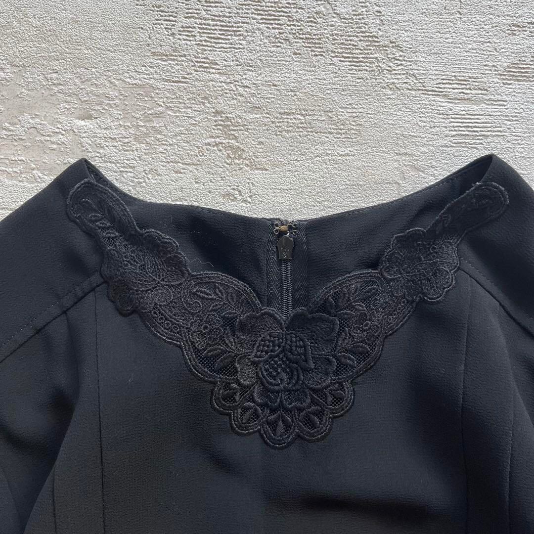 東京ソワールの上質なブラックフォーマルワンピースです。胸元に繊細なレース刺繍が施され、落ち着きのある華やかさを演出してくれます。半袖デザインでシーズンを問わず着用しやすく、すっきりとしたシルエットが体のラインをきれいに見せてくれる一枚。冠婚葬祭、法事、お別れの会など幅広いシーンで活躍します。生地はしっかりとした高級感のある素材を使用しており、着心地も快適。シンプルながらも上品さを兼ね備えたフォーマルウェアをお探しの方におすすめです。