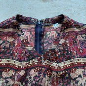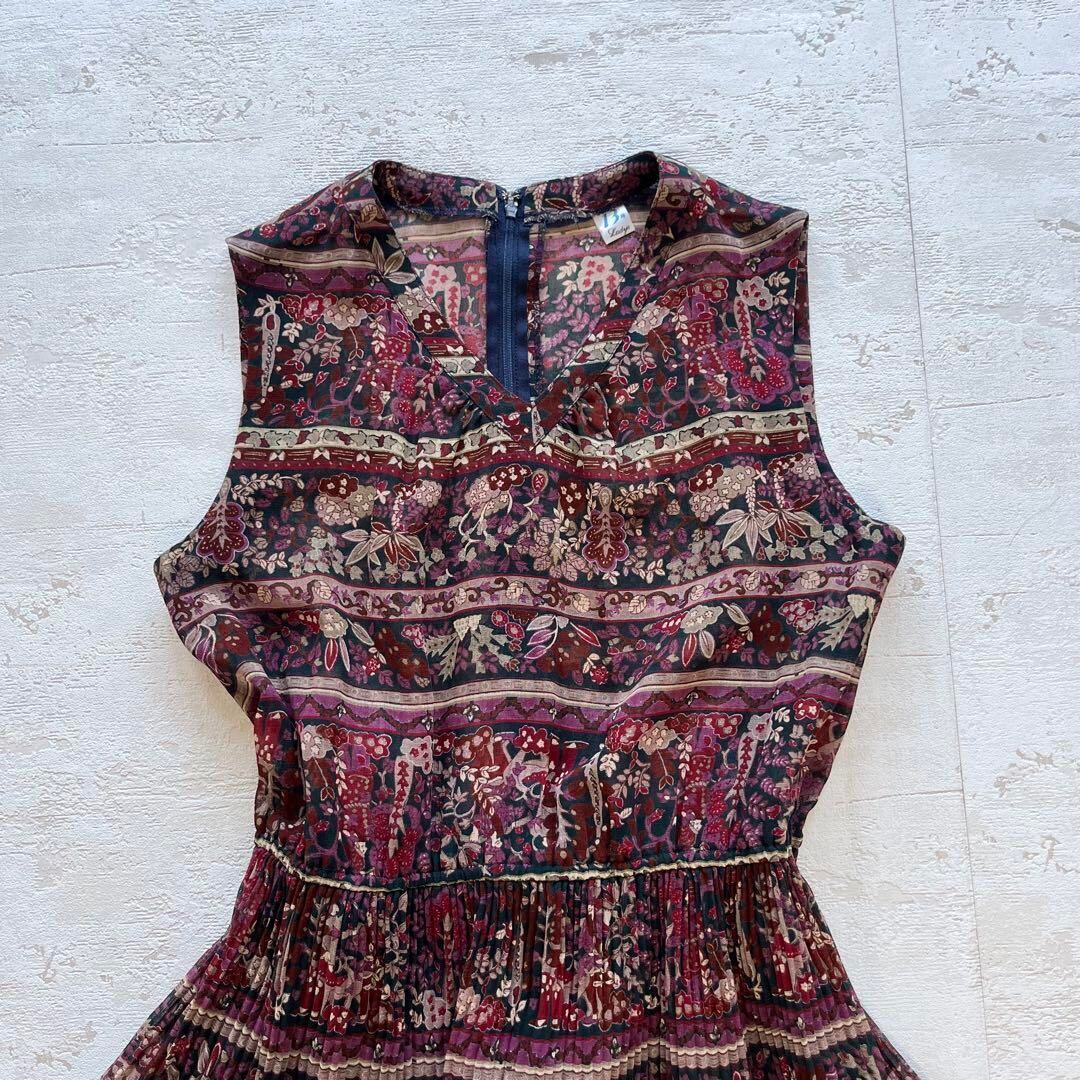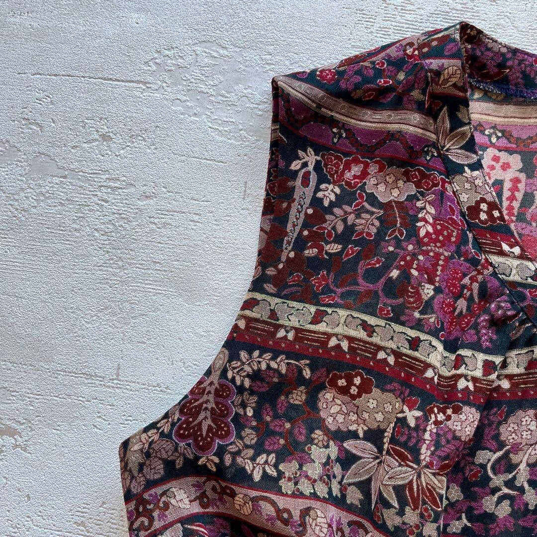 レトロ感漂う、花柄のノースリーブワンピースです。落ち着いたボルドー・ブラウン系の色味に、ボタニカル調の小花柄が全体にあしらわれた大人可愛いデザイン。13号(タグ表記Lady’s 13AR)相当のサイズ感で、ウエスト部分は程よくフィットし、スカートはふんわりと広がるシルエットになっています。裏地付きで透けにくく、春夏は一枚で、秋冬はカーディガンやジャケットを羽織って長く楽しめます。ヴィンテージや古着好きな方、レトロファッションを楽しみたい方におすすめの一枚です。お出かけやデイリー、旅行など幅広く活躍します。
