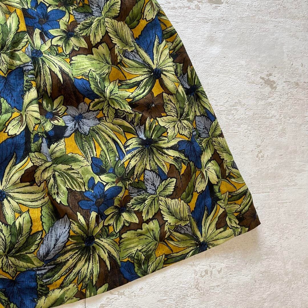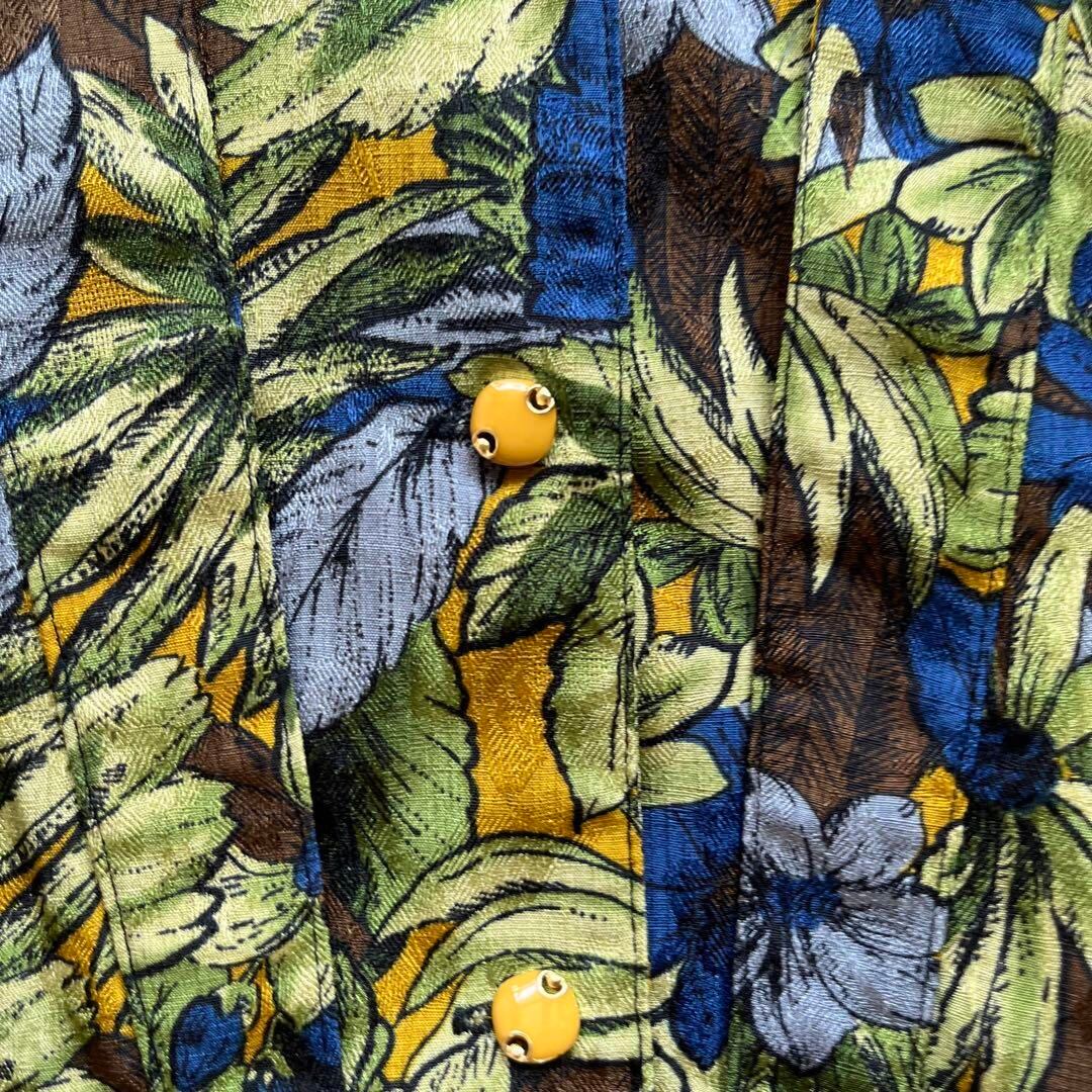 昭和レトロ感漂う花柄ワンピースです。イエローやグリーンを基調に、ブルーやブラウンがアクセントになった落ち着いた配色が魅力。前ボタン仕様で着脱しやすく、ウエスト切替デザインでスタイルをすっきりと見せてくれます。ロング丈なので上品さがあり、大人のレトロコーデにもぴったり。半袖タイプで春夏のお出かけや旅行、イベントにも活躍します。ヴィンテージや古着好きな方、レトロファッションを楽しみたい方におすすめの一枚です。普段着にはもちろん、特別なお出かけにも映えるワンピースです。