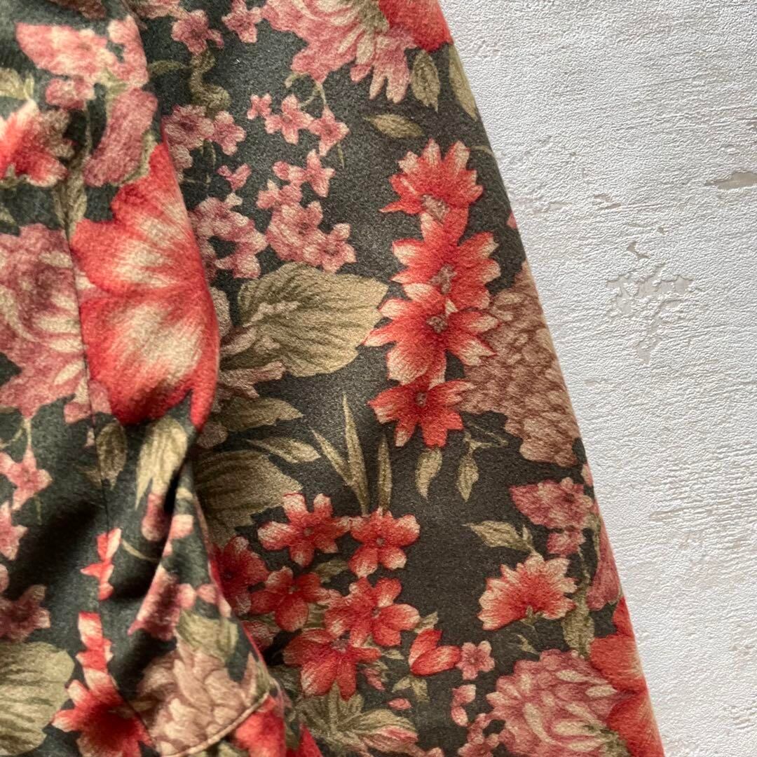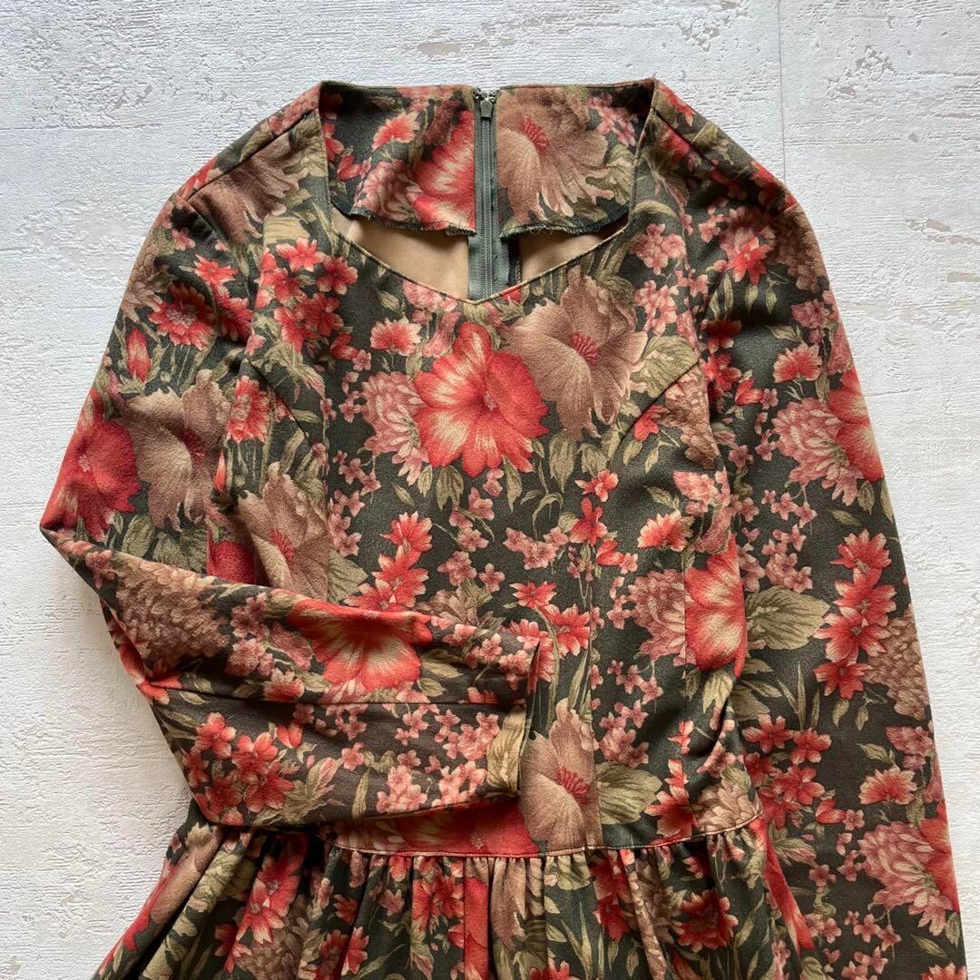 深みのあるグリーン地に、落ち着いた赤やベージュの花々が映える昭和レトロな長袖ワンピースです。しっかりとした生地感で、秋冬シーズンにぴったり。ウエストにかけて自然に広がるAラインシルエットが女性らしく、体型をすっきりと見せてくれます。クラシカルな雰囲気ながらも上品で、お出かけやカフェ巡り、特別な日のコーデにもおすすめ。ヴィンテージ感のあるフラワープリントがお好きな方にぴったりの1着です。裏地ありで着心地も良好。