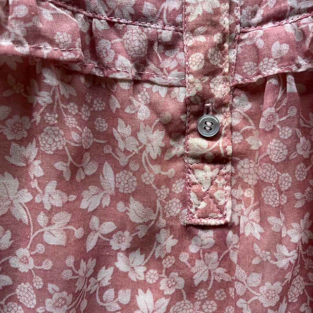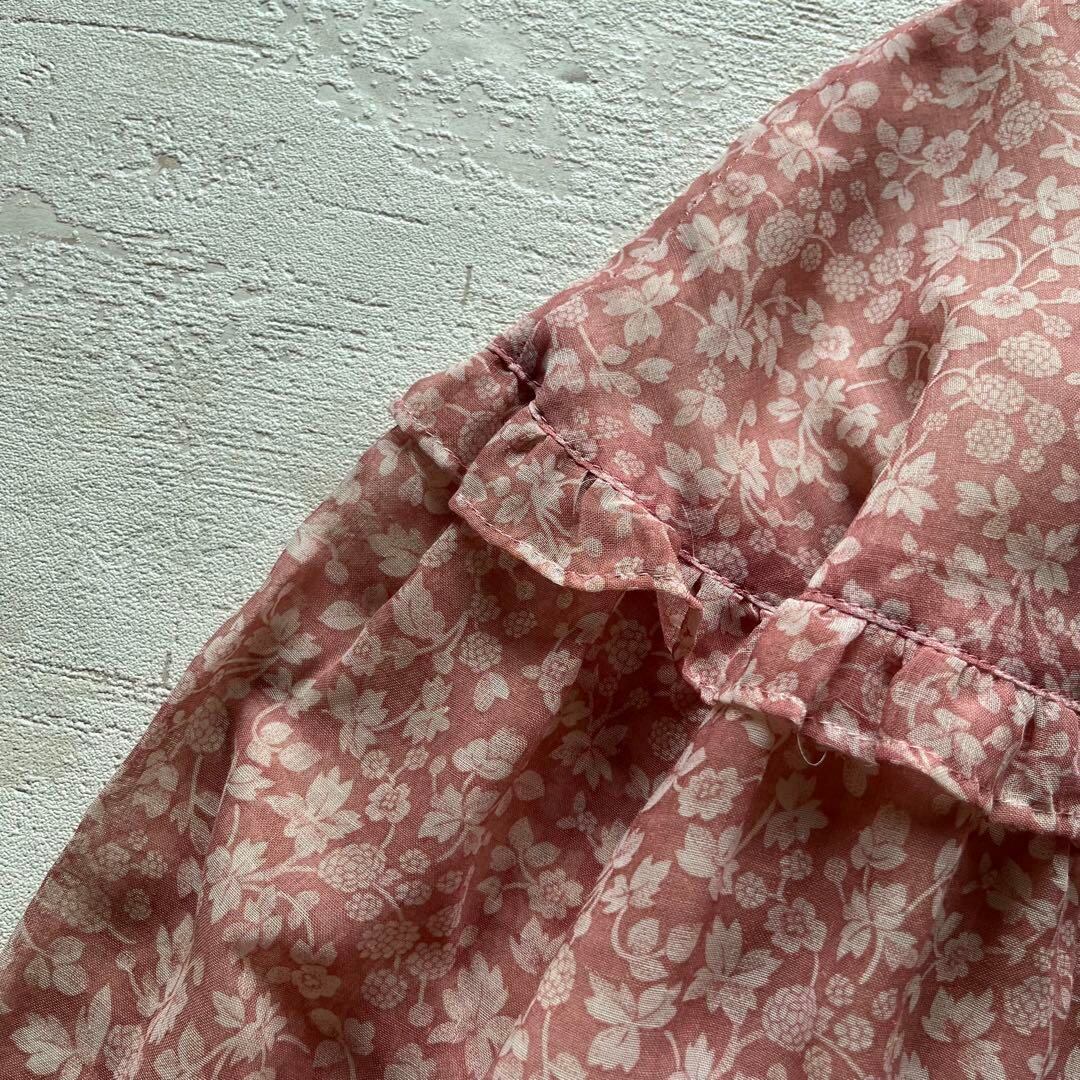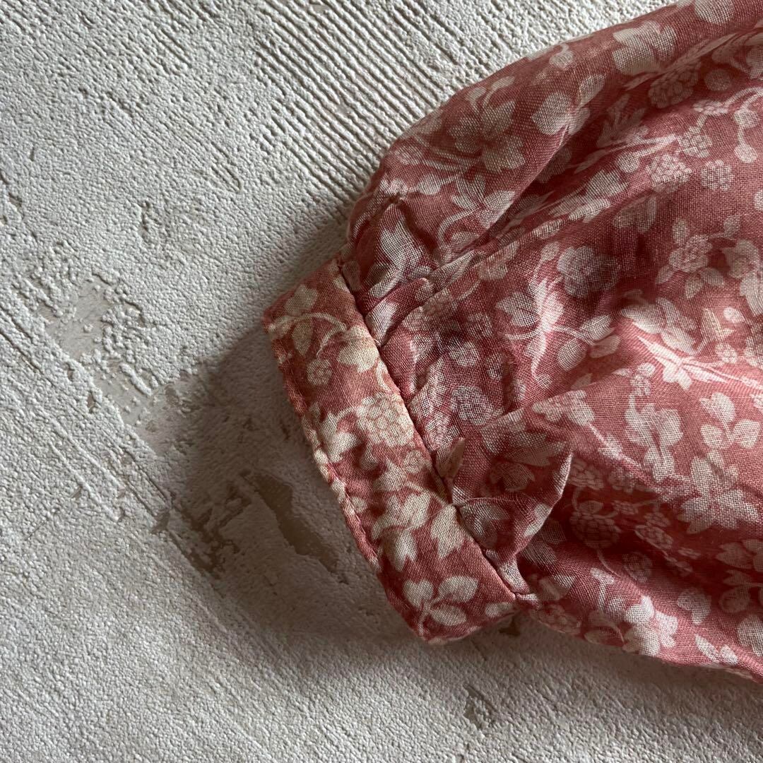 淡いピンク地にホワイトの小花柄が散りばめられた、レトロ感漂うロングワンピースです。襟元のフリルとウエスト切替デザインが女性らしさを引き立て、ふんわり広がるシルエットが上品な雰囲気を演出します。軽やかな素材感で春先や秋口にも着やすく、一枚で主役級の存在感。古着女子やレトロファッション好きの方におすすめの一枚です。羽織りと合わせても可愛く、デイリーからお出かけまで幅広く活躍します。古着ならではの風合いをお楽しみいただける方にぜひ。