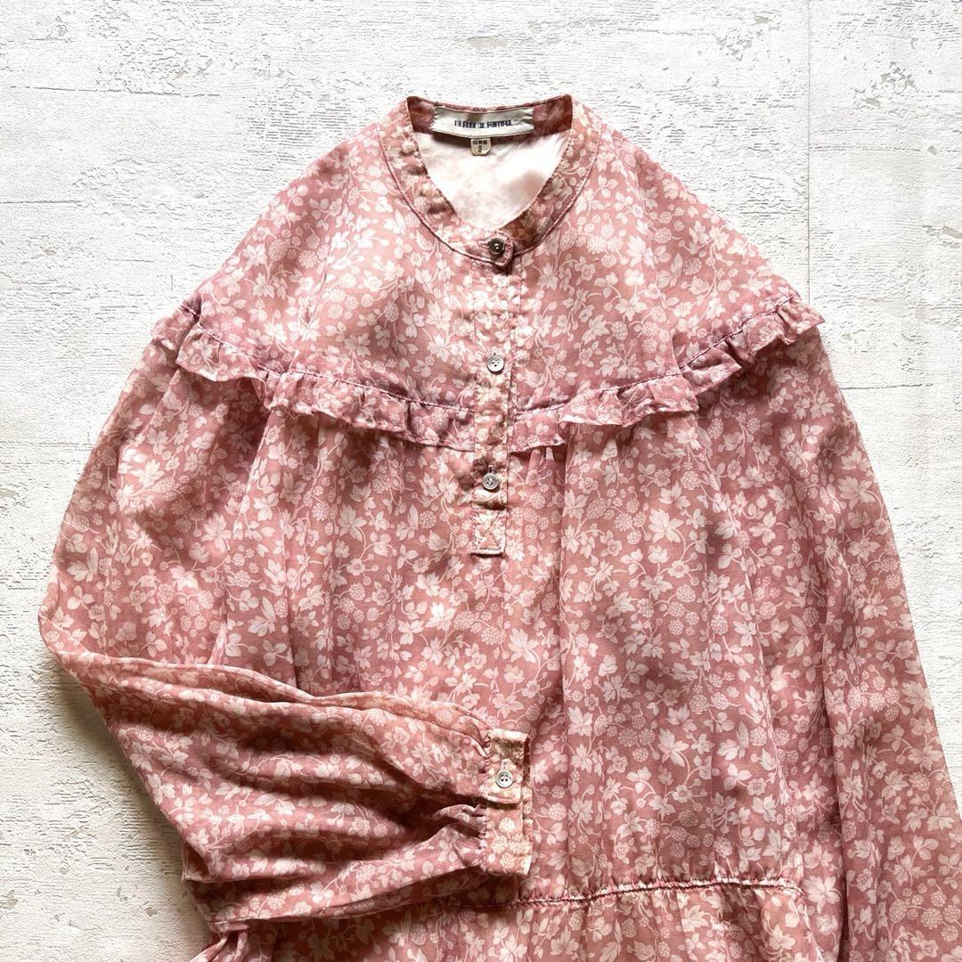昭和レトロ 小花柄 フリル付き ロングワンピース ピンク系 長袖 E